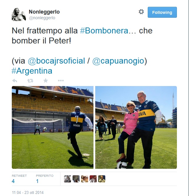 BUENOS AIRES – Il compassato presidente del Senato Pietro Grasso che tira un calcio di rigore sotto la curva della “Doce” alla Bombonera, con la maglia numero 7 del Boca Juniors, personalizzata per l’occasione. È successo anche questo. Ci sono le prove su Twitter. La fonte è @nonleggerlo, ormai leggendario avvistatore di amenità e #shabadabada vari.