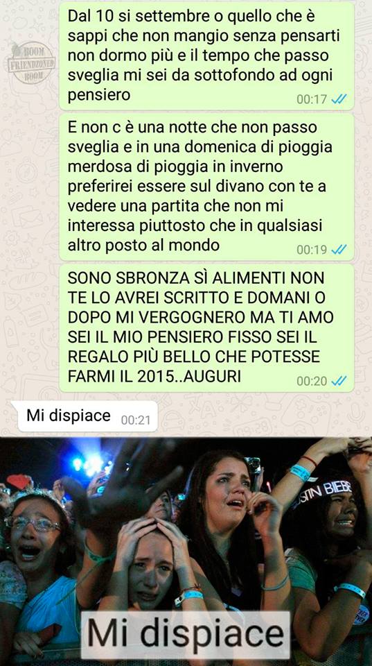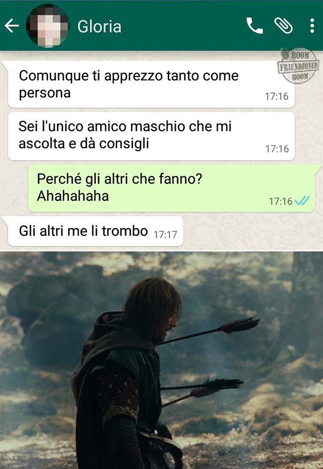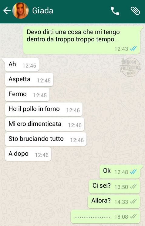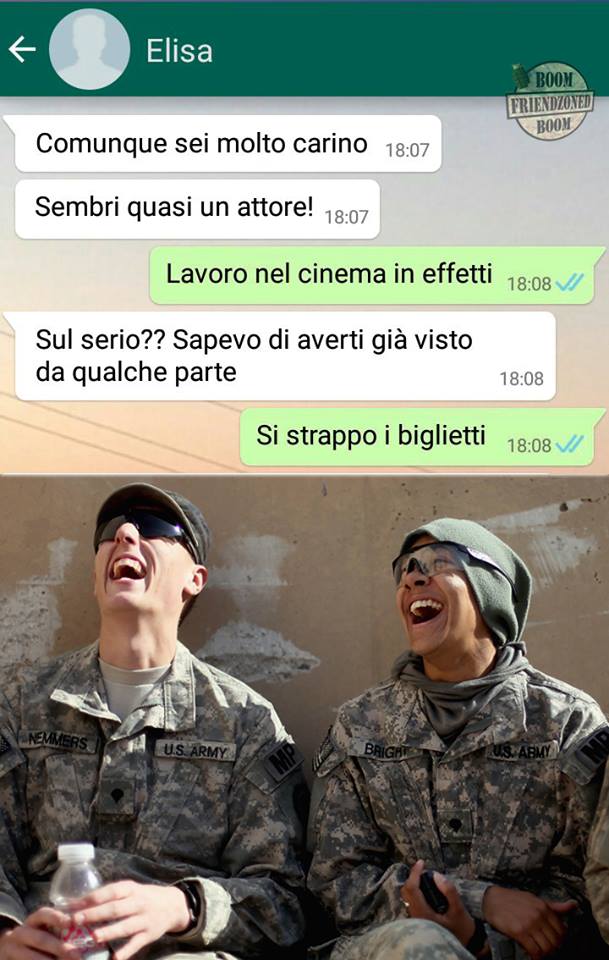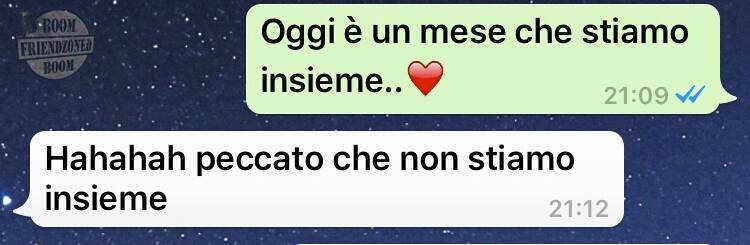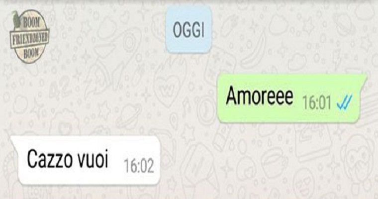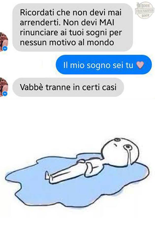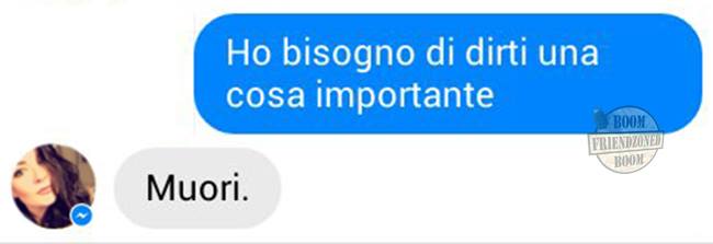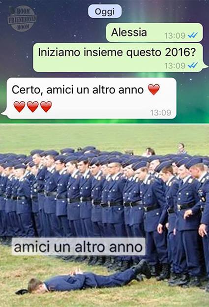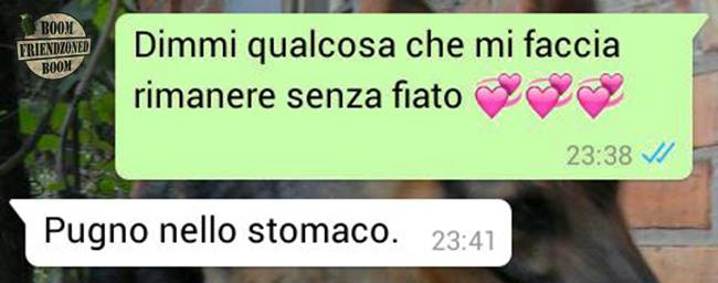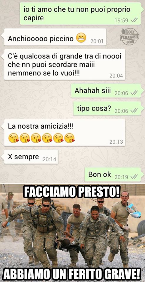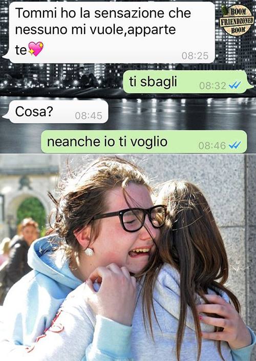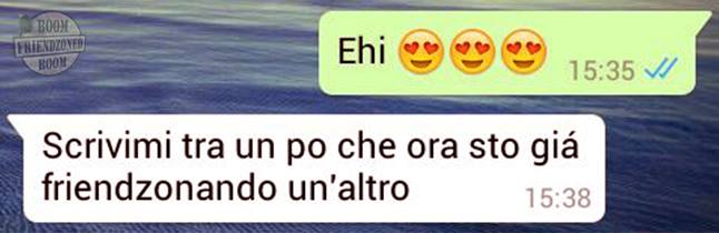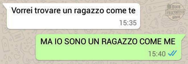 ROMA – La pagina Facebook si chiama “Boom. Friendzoned” (questo il link) ed è – con oltre un milione di fan – una delle pagine Facebook più popolari e amate. La pagina raccoglie le conversazioni più improbabili su WhatsApp tra le ragazze e i loro migliori amici. Migliori amici che sperano sempre di strappare qualcosa di più delle semplice amicizia dalle ragazze con cui parlano su WhatsApp. E ragazze che regolarmente ricordano al ragazzo il loro ruolo di amico. E niente più. Per l’appunto la “Friend zone”, la zona d’amicizia dove tutti sono costretti a restare.