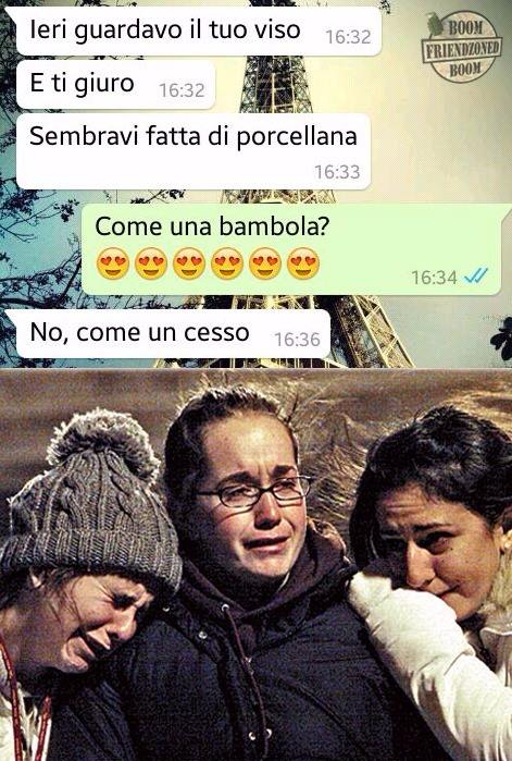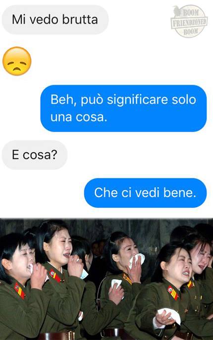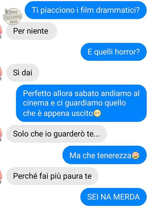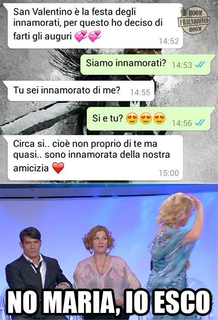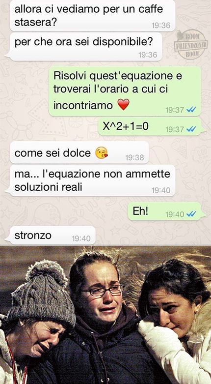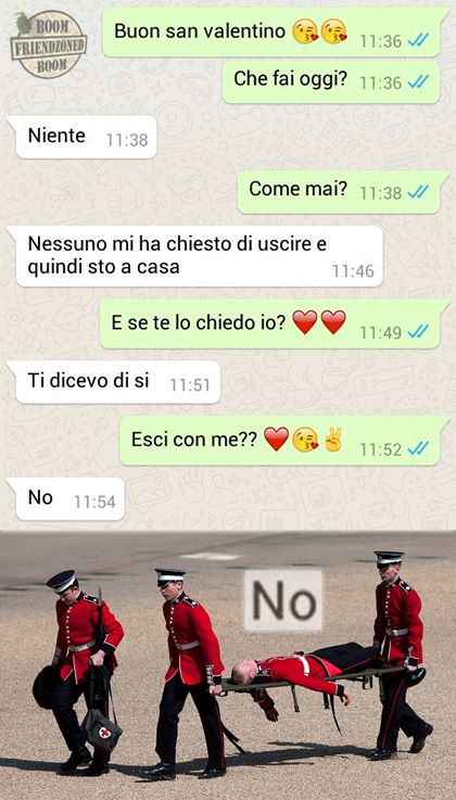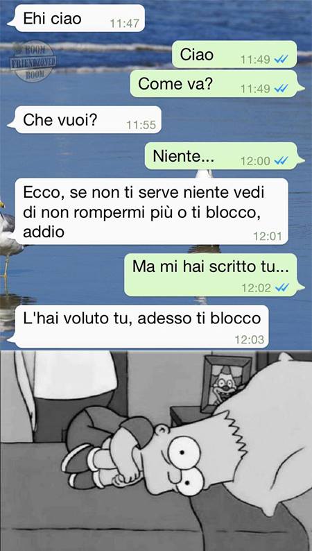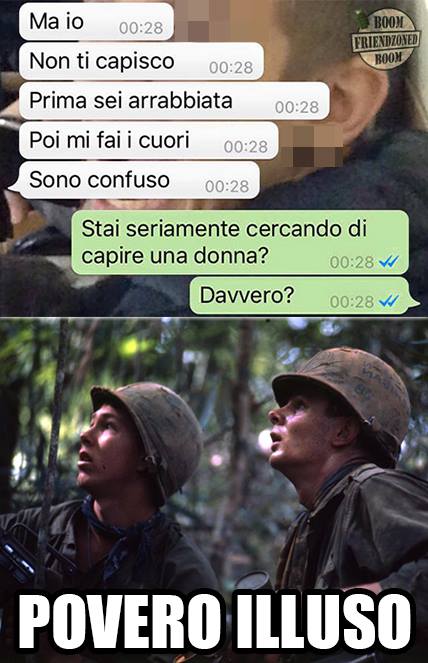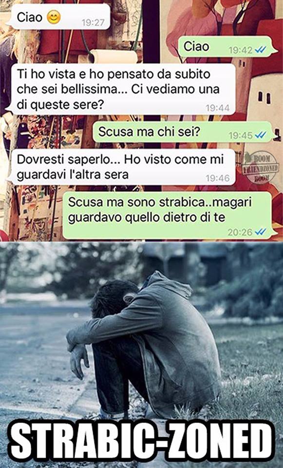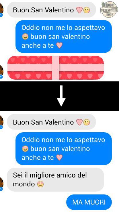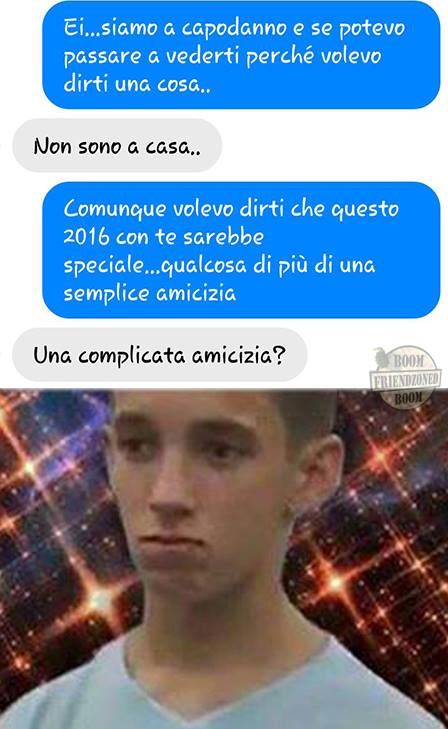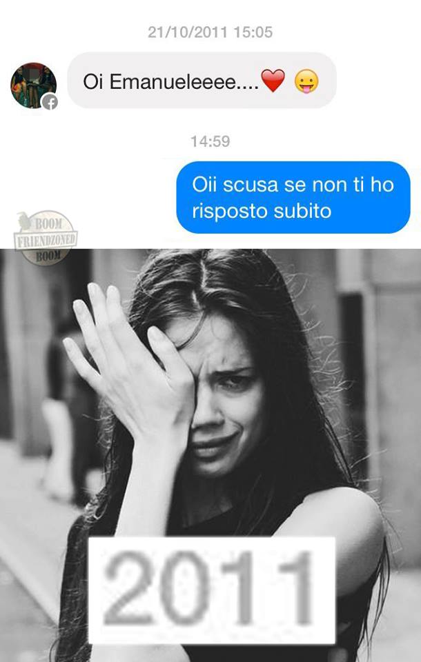 ROMA – La pagina Facebook si chiama “Boom. Friendzoned” (questo il link) ed è – con oltre un milione di fan – una delle pagine Facebook più popolari e amate. La pagina raccoglie le conversazioni più improbabili su WhatsApp tra le ragazze e i loro migliori amici. Migliori amici che sperano sempre di strappare qualcosa di più delle semplice amicizia dalle ragazze con cui parlano su WhatsApp. E ragazze che regolarmente ricordano al ragazzo il loro ruolo di amico. E niente più. Per l’appunto la “Friend zone”, la zona d’amicizia dove tutti sono costretti a restare.