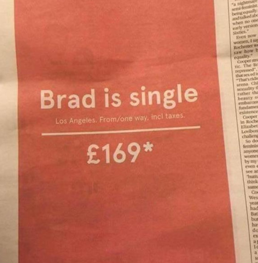 LOS ANGELES – “Brad Pitt è single. Vola a Los Angeles. A partire da 190 euro solo andata”: una compagnia aerea norvegese, la Norwegian Air Shuttle, ha preso spunto dal divorzio dell’anno per invitare i suoi clienti a volare verso la Hollywood dove un affascinante cinquantenne è stato appena piantato in asso dalla moglie a mezzo stampa, con un comunicato che mette in dubbio anche le sue capacità di padre.