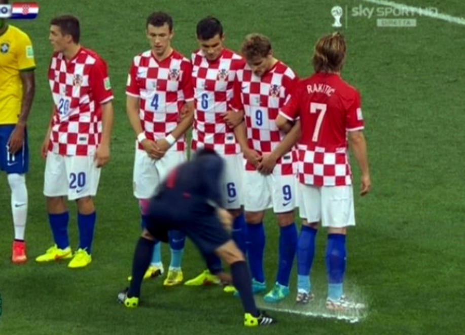 SAN PAOLO (BRASILE) – Brasile-Croazia, punizione per i brasiliani. Neymar è pronto a battere, i croati in barriera provano ad avvicinarsi e allora l’arbitro (tanto discusso per il rigore) allora tira fuori (prima volta ai Mondiali) la bomboletta spray per posizionarli alla distanza regolamentare. Striscia per terra e barriera senza scampo, oltre la linea non si può andare.