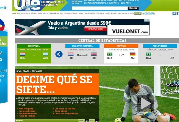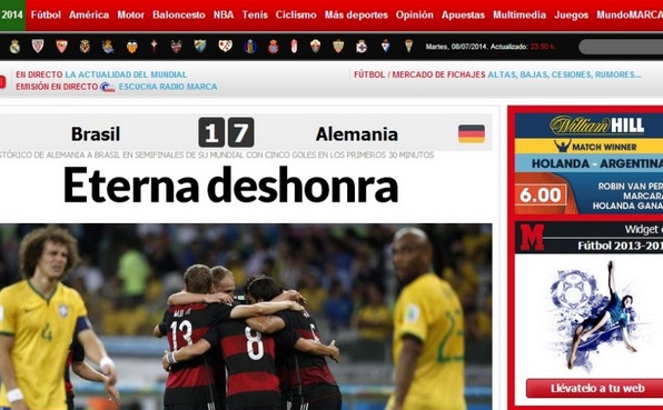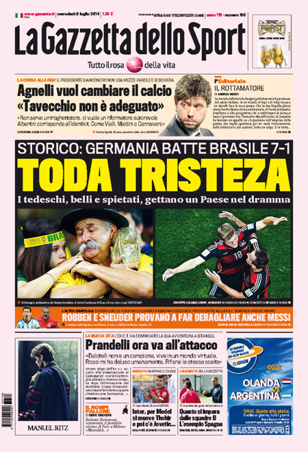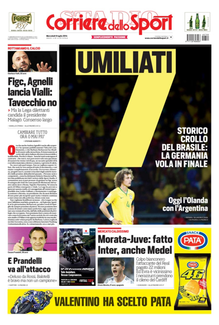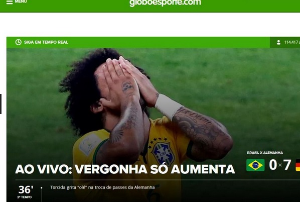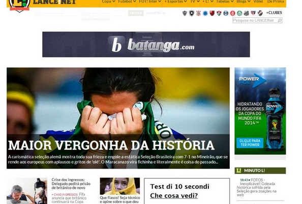 SAN PAOLO – La disfatta del Brasile contro la Germania viene definita “Vergogna storica” e “Umiliazione storica” dai principali siti brasiliani. Il sito O Globo unisce i due concetti: “Vergogna e umiliazione”. Nessuno, al momento, chiede le dimissioni del ct Felipe Scolari.