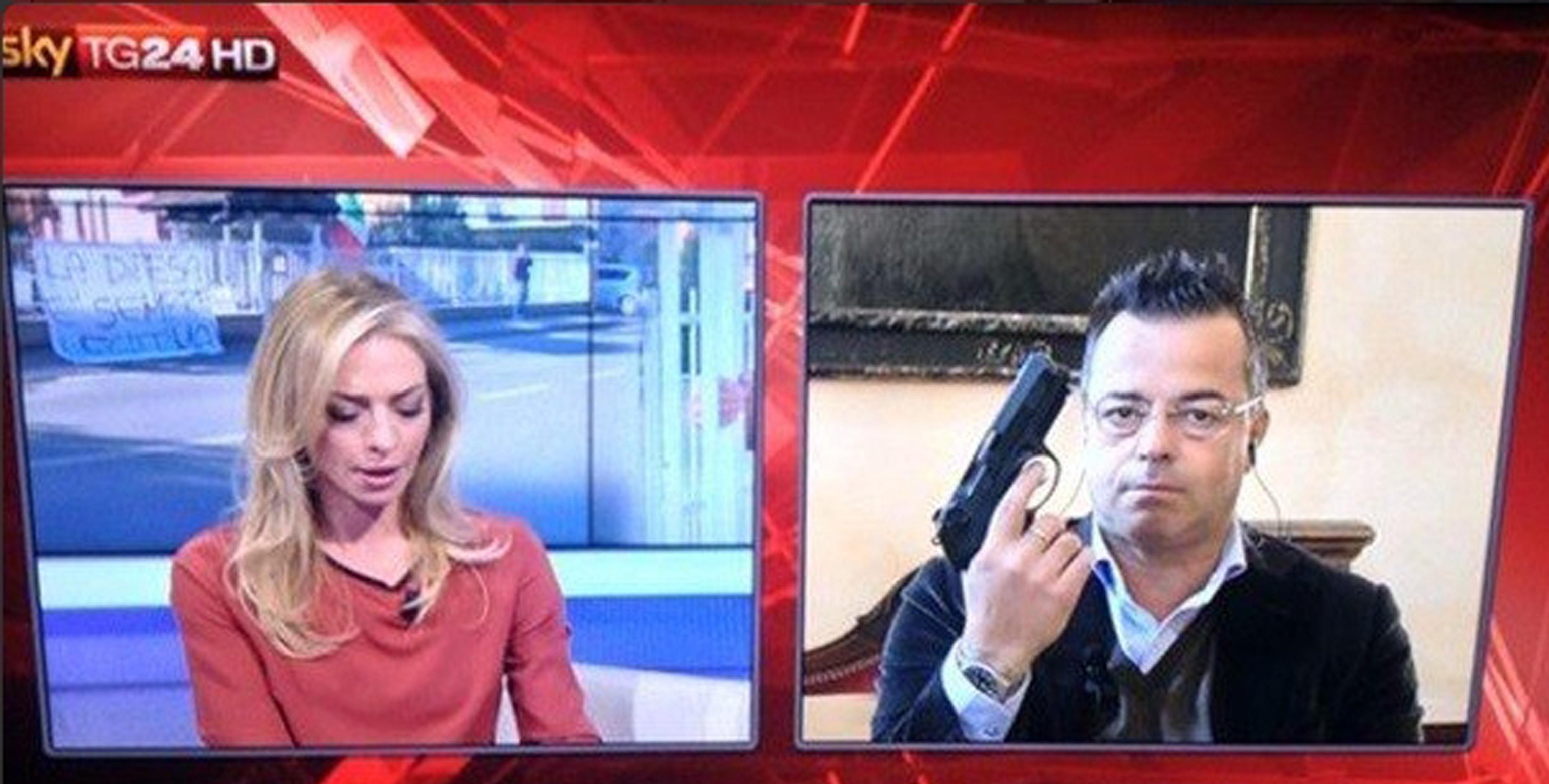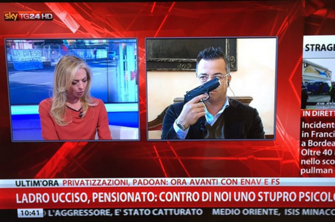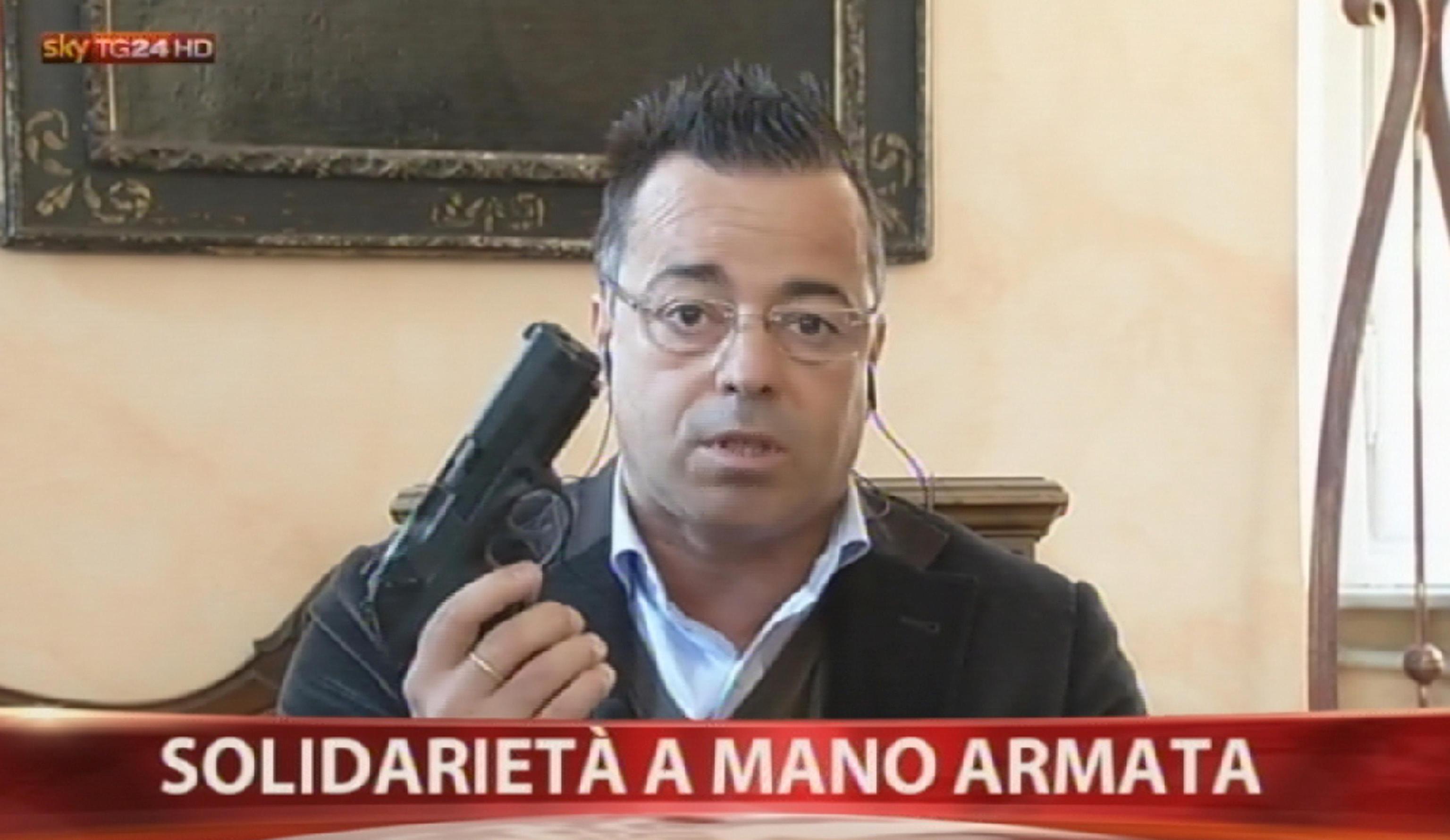 ROMA – L’eurodeputato della Lega Nord Gianluca Buonanno si è presentato con una pistola in tv e l’ha mostrata ai telespettatori. Il tutto succede su Sky Tg 24 dopo che lo stesso Buonanno aveva annunciato pochi giorni fa l’idea di introdurre il bonus pistola nel comune di Borgosesia in Piemonte dove è sindaco. Buonanno è intervenuto in collegamento nel corso di un talk show in cui si parlava del caso di Francesco Sicignano, il pensionato indagato per omicidio volontario dopo aver ucciso un rumeno di 22 anni che stava introducendosi nella sua casa a Vaprio d’Adda in provincia di Milano.