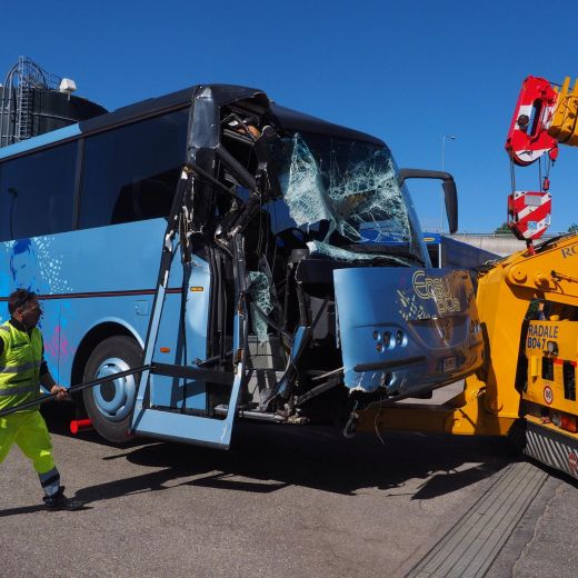 Sulla dinamica sembra che il pullman della gita che viaggiava davanti, trovando la carreggiata bloccata per l’incidente, sia riuscito a frenare in tempo, venendo però poi tamponato da una bisarca contro la quale è andato a urtare il secondo bus. Nell’impatto, violentissimo secondo quanto raccontato da alcuni ragazzi, sono andati in frantumi i vetri ed è stata divelta la parte posteriore di uno due mezzi (foto Ansa).