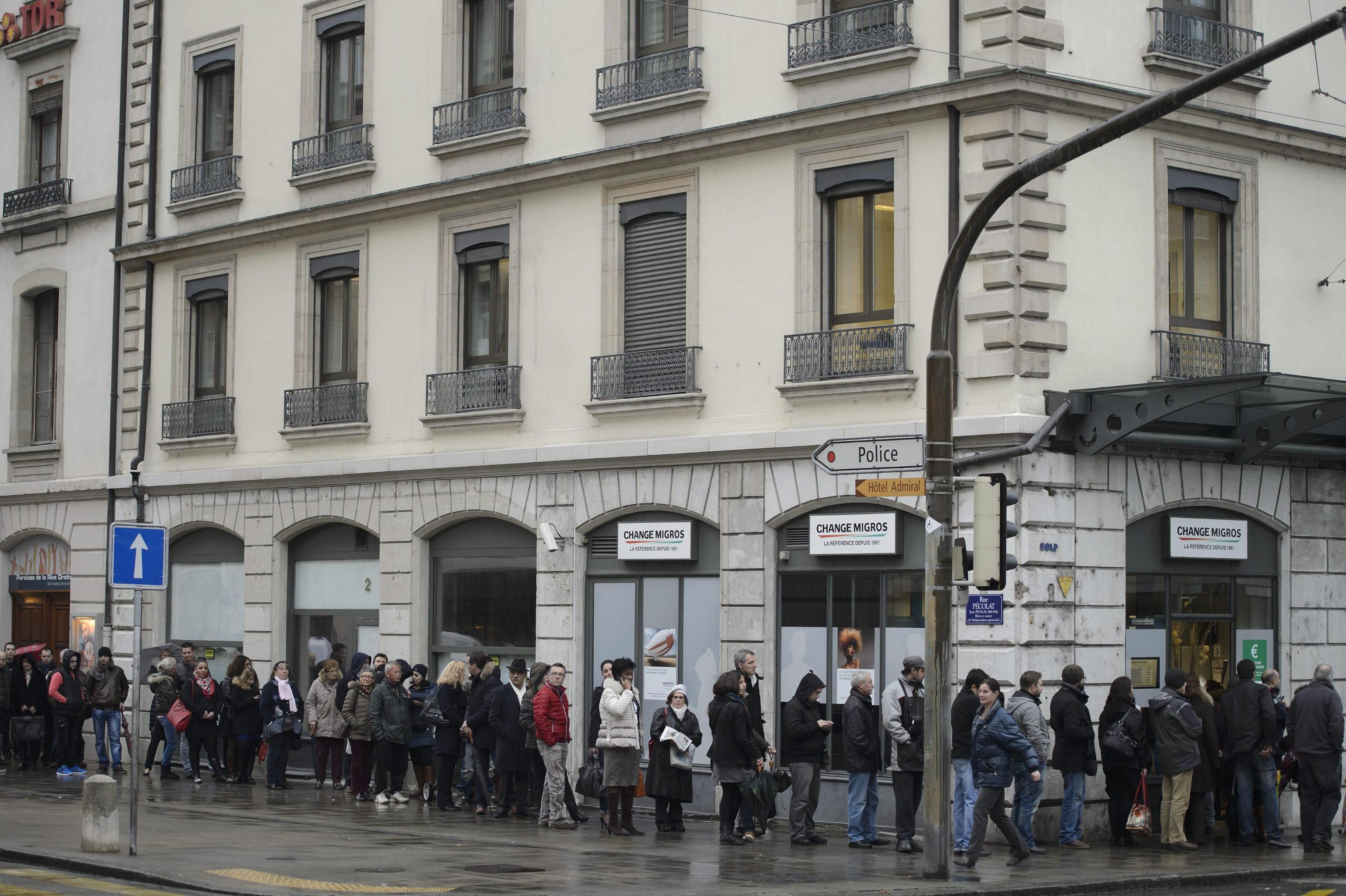 GINEVRA (SVIZZERA) – Gente in fila in uno sportello bancario di Ginevra in Svizzera, dopo la decisione della Banca centrale di cancellare il cambio fisso a quota 1,2 con l’euro che manteneva da 3 anni. Si cambiano euro per franchi prima che l’eventuale manovra espansiva della Bce indebolisca ancora la moneta unica europea.