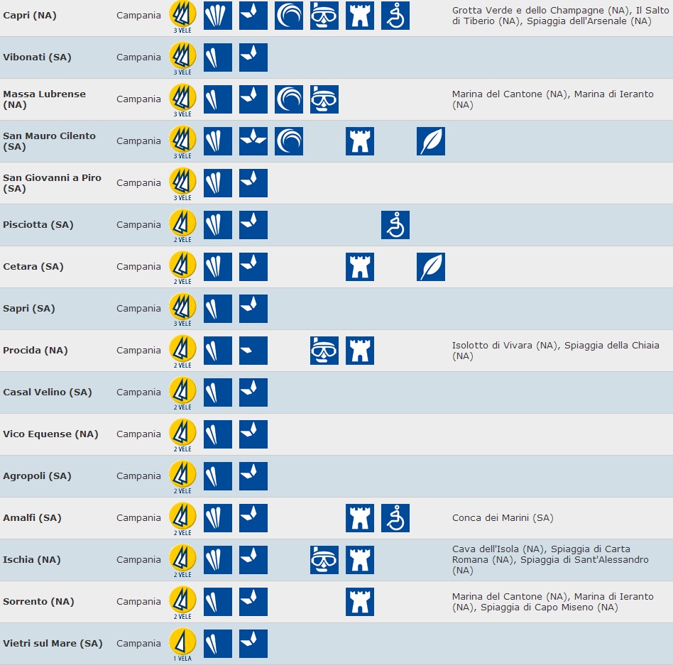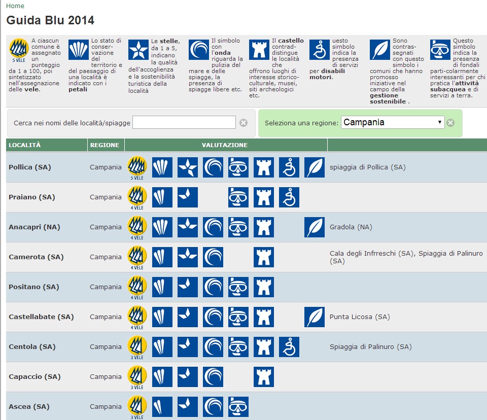 La classifica Guida Blu è stilata ogni anno da Legambiente: le spiagge vengono classificate a seconda delle “vele blu” assegnate alle località esaminate: 5 vele è il massimo del riconoscimento.