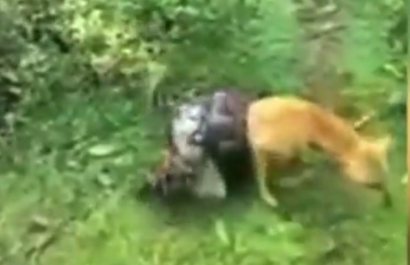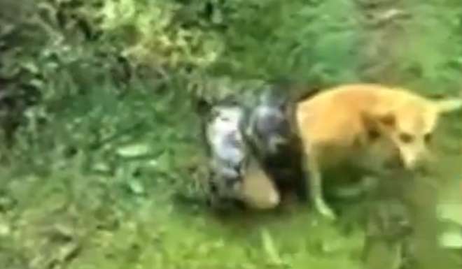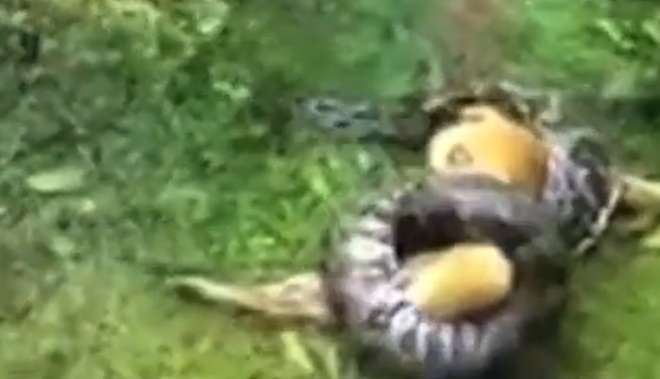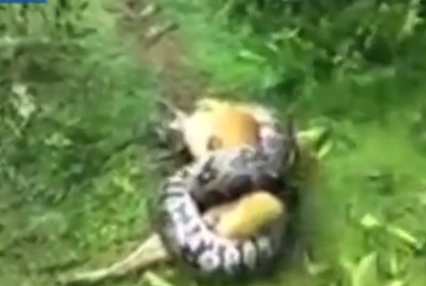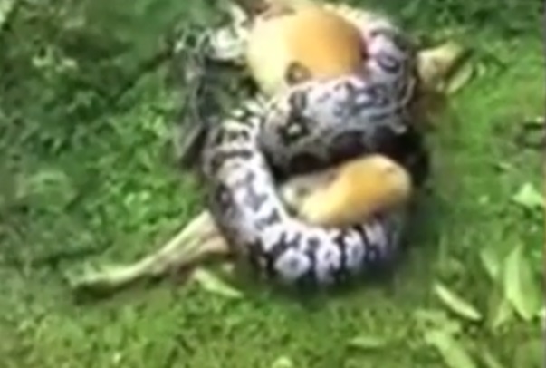 NUOVA DELHI (INDIA) – Un pitone gigante sta soffocando un cane bastardino con lo scopo di mangiarlo. Il rettile lo ha completamente immobilizzato e il cane sembra ormai incapace di reagire.