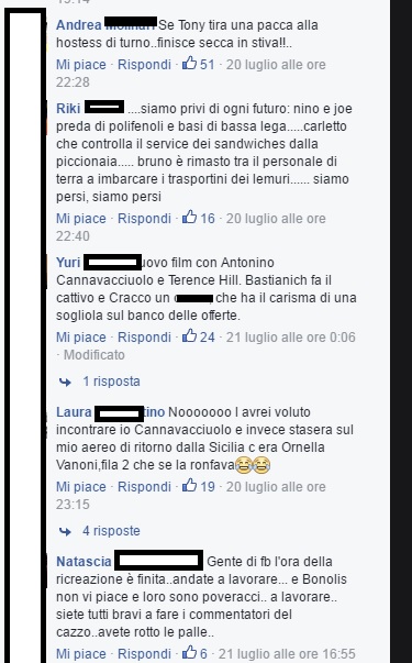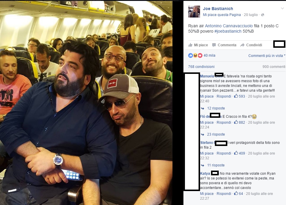 ROMA – La settimana scorsa tutti a criticare la famiglia Bonolis, “rea” di aver volato su un jet privato a Formentera. Questa invece, tutto il contrario. A finire sotto il fuoco incrociato degli “haters” su Facebook, sono state le due star di Masterchef, Antonino Cannavacciuolo e Joe Bastianich. I due pubblicano una foto dall’aereo ma in calce al post piovono insulti. “A’ pidocchiosi”. A infastidire i fan pare sia stata proprio la scelta di viaggiare low cost, per l’esattezza su un volo Ryanair, fila 1 posti B e C (come annota Bastianich nella didascalia)