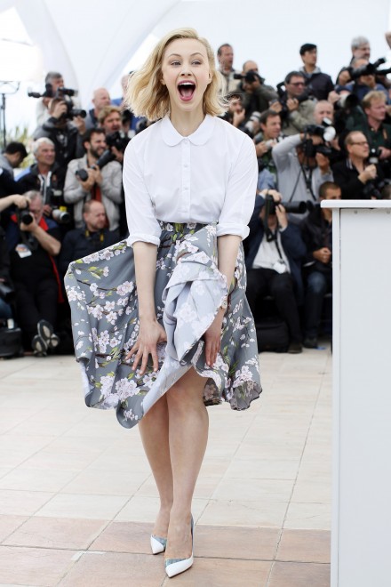 CANNES – Incidente sul red carpet del Festival di Cannes per Sarah Gadon: all’attrice protagonista con Mia Wasikowska e Julianne Moore, del film di David Cronenberg “Maps to the Stars”,vola su la gonna per colpa del vento.