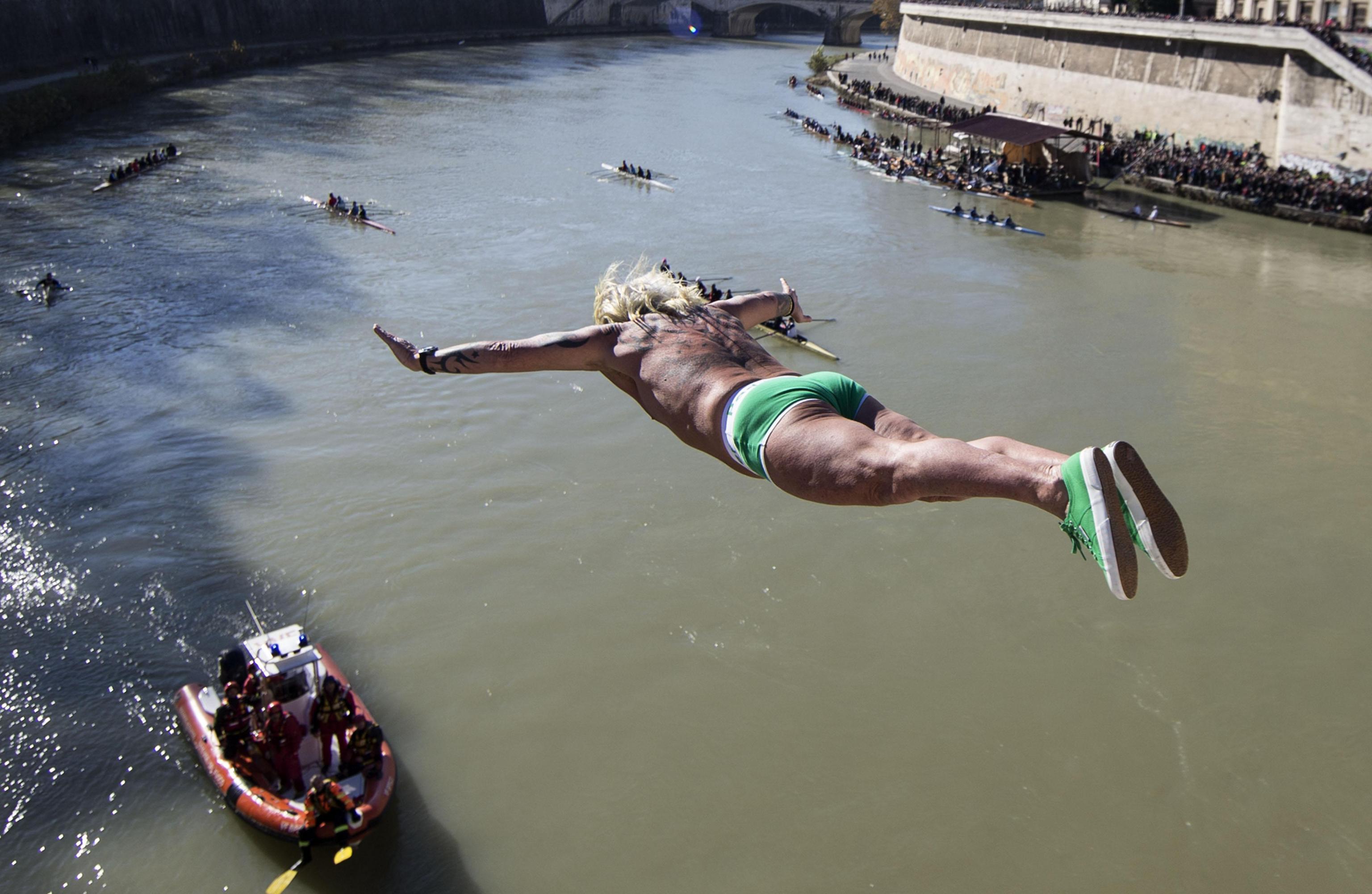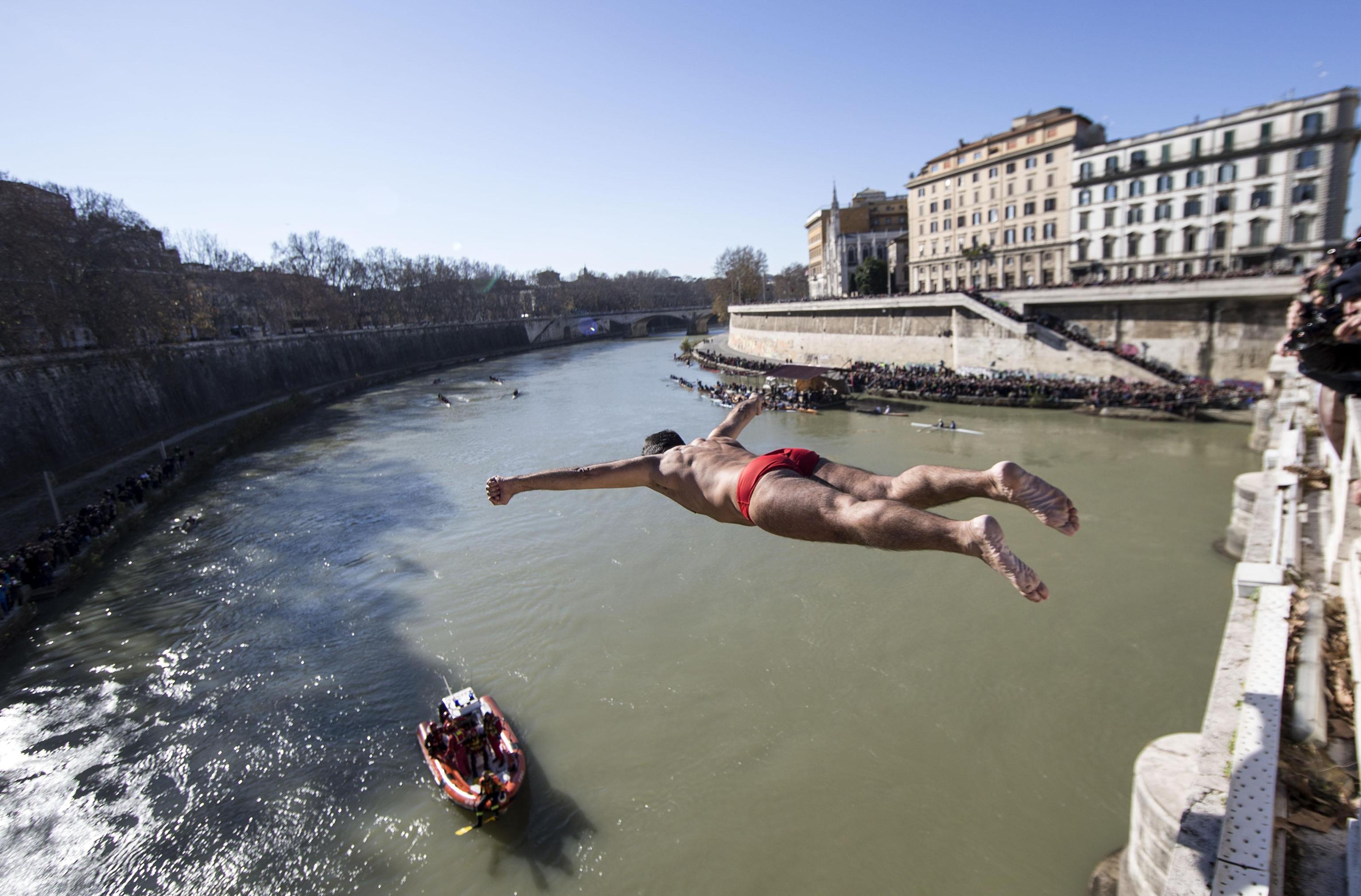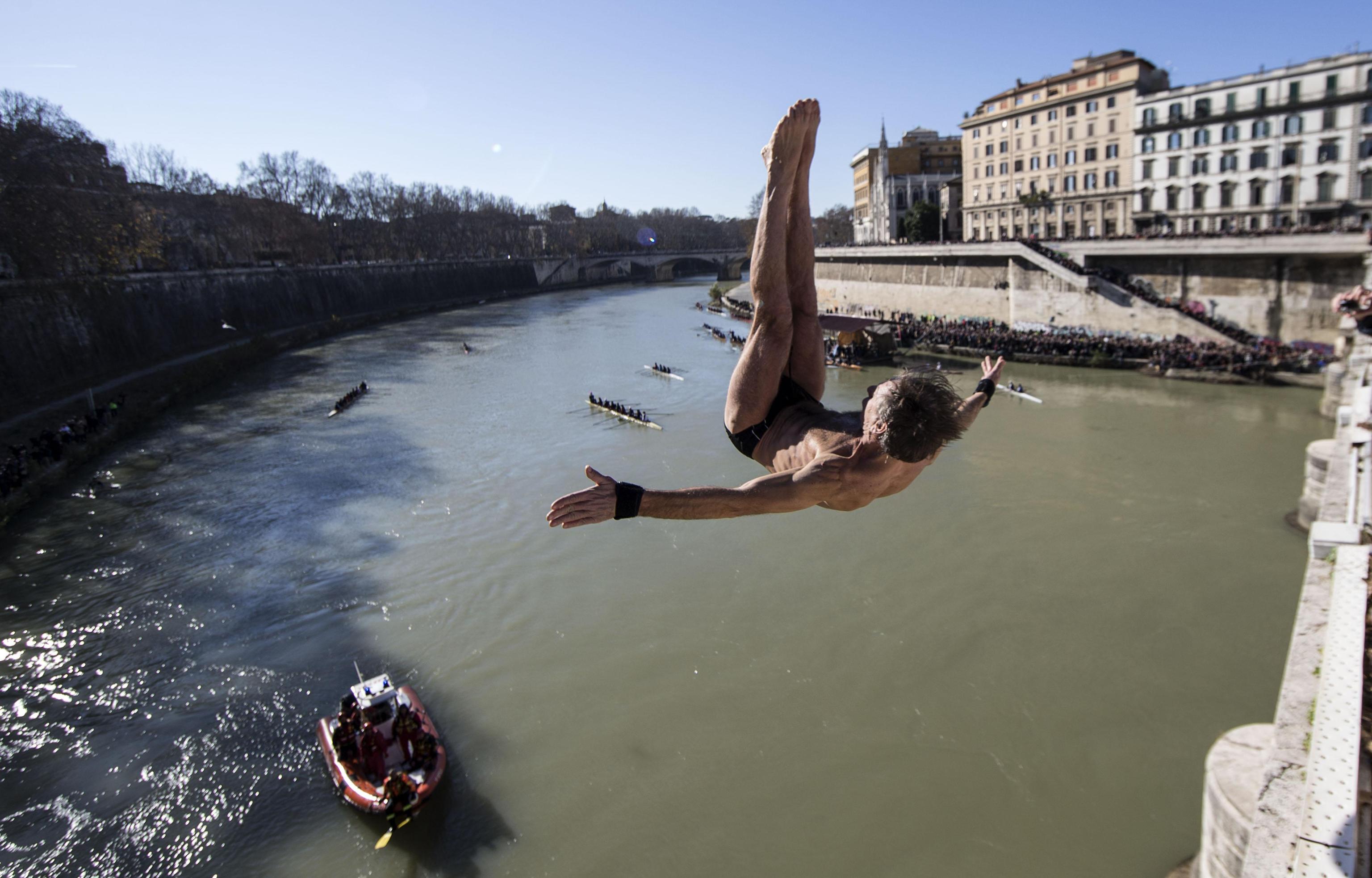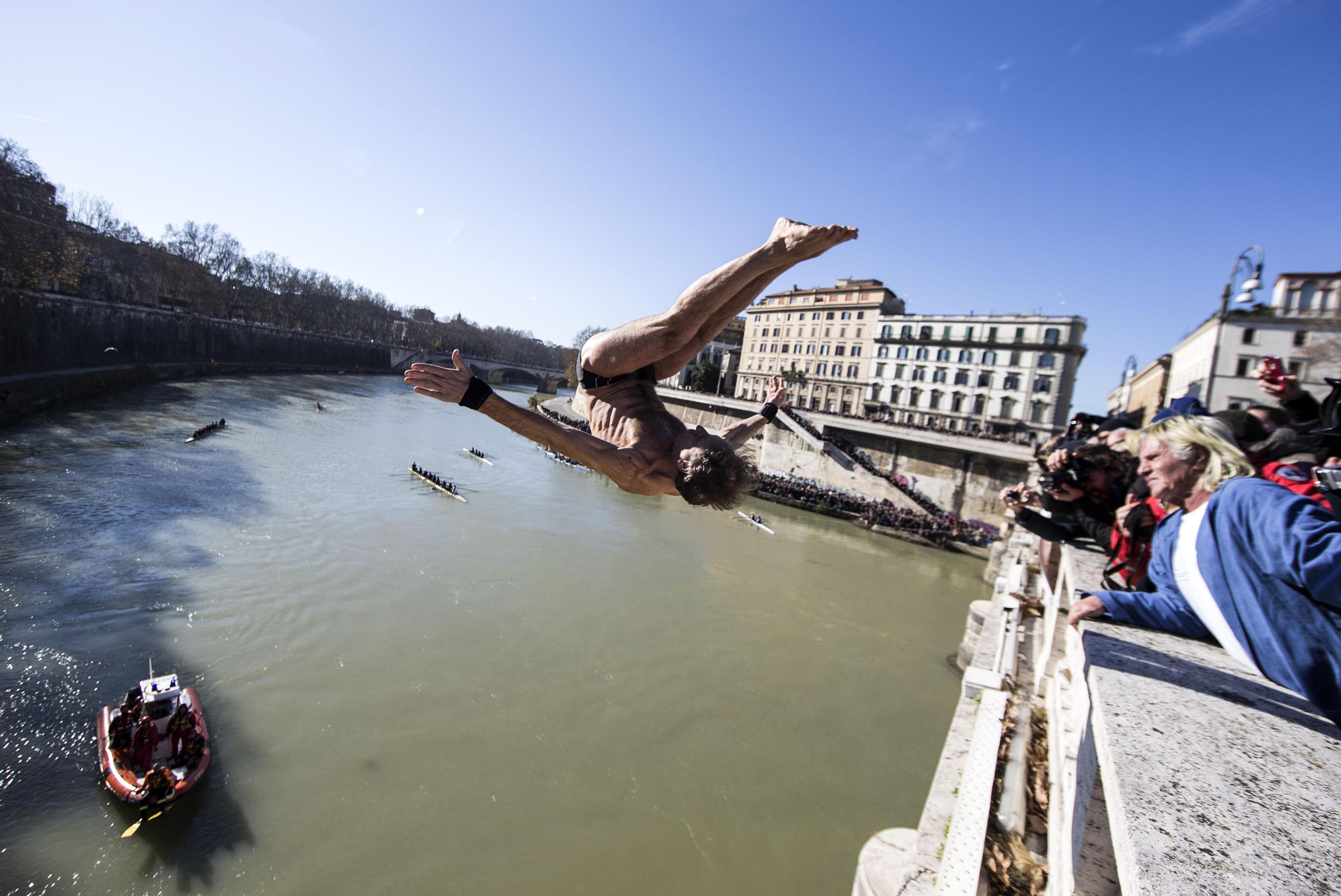 Al suono del cannone del Gianicolo, a mezzogiorno in punto, il bagnino di Castelfusano ha rinnovato la tradizione che da 27 anni lo vede protagonista nel cuore della Capitale. Quest’anno però mister Ok ha dovuto sfidare anche il freddo eccezionale che avvolge anche Roma. Il volo d’angelo ha attirato l’attenzione di romani e turisti, incuriositi dall’esibizione.