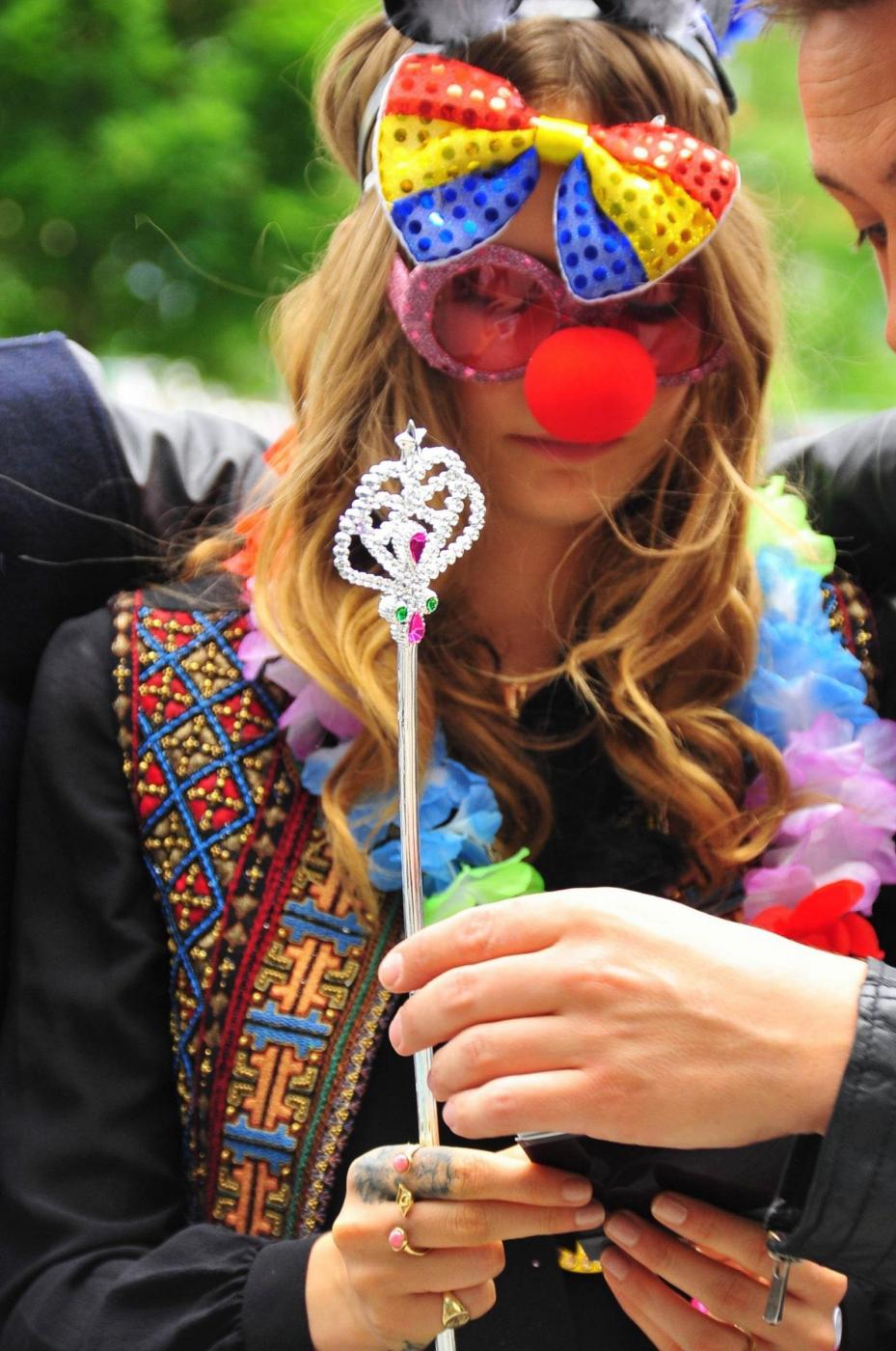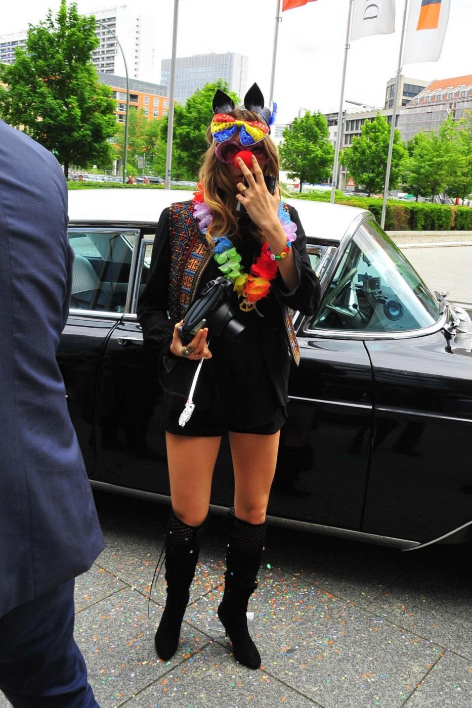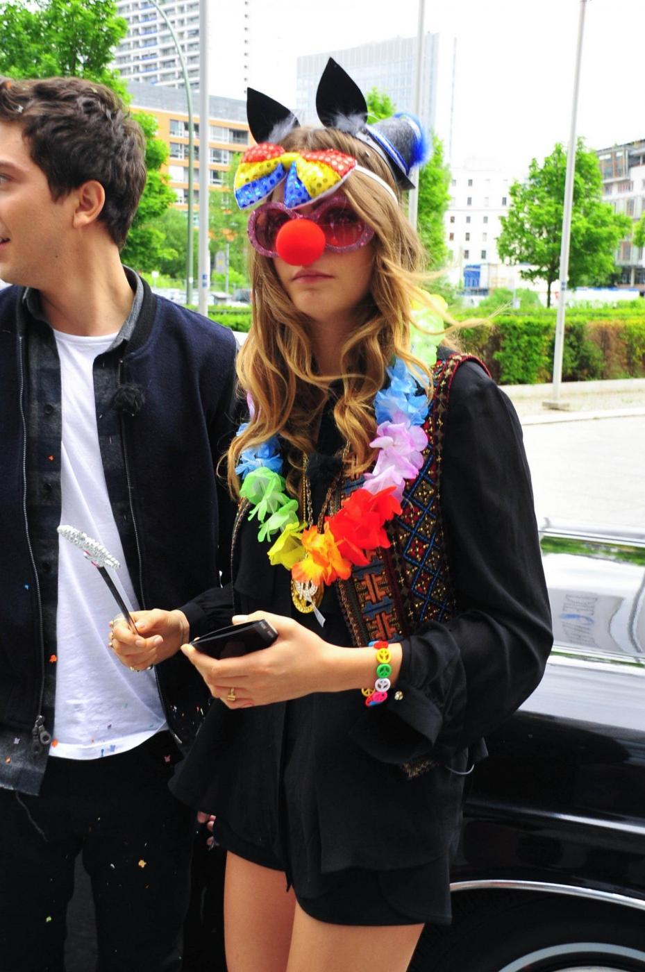 A differenza della tappa spagnola, in cui la musa di Karl Lagerfeld si è mostrata in tutto il suo splendore indossando un mini-tailleur a gonna di Chanel bianco e nero, a Berlino Cara ha lasciato di stucco presentandosi con occhiali finti, naso rosso da pagliaccio e altri orpelli più da clown che da modella.