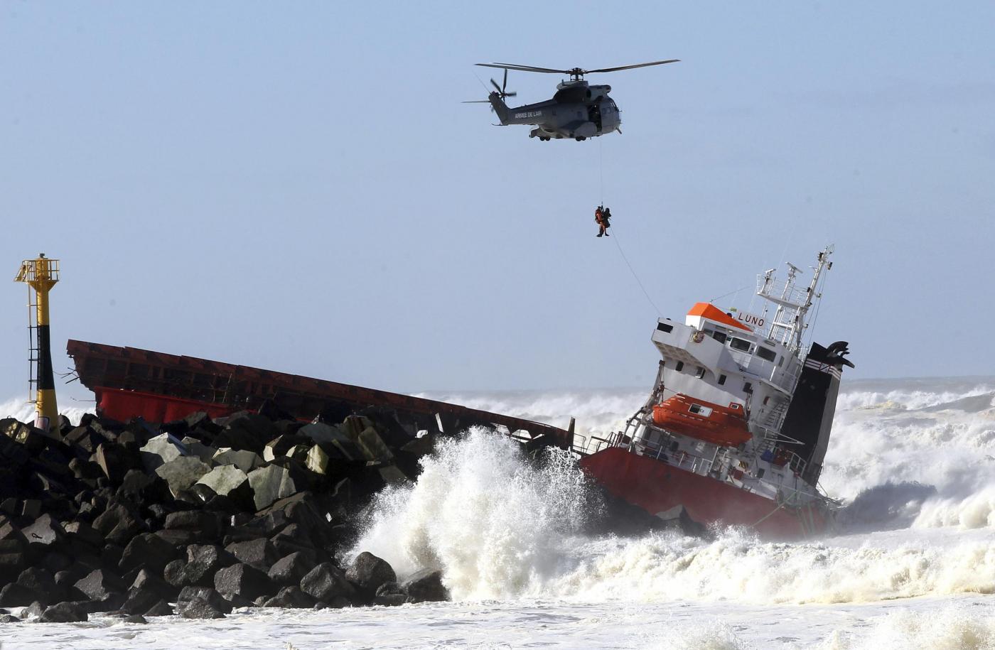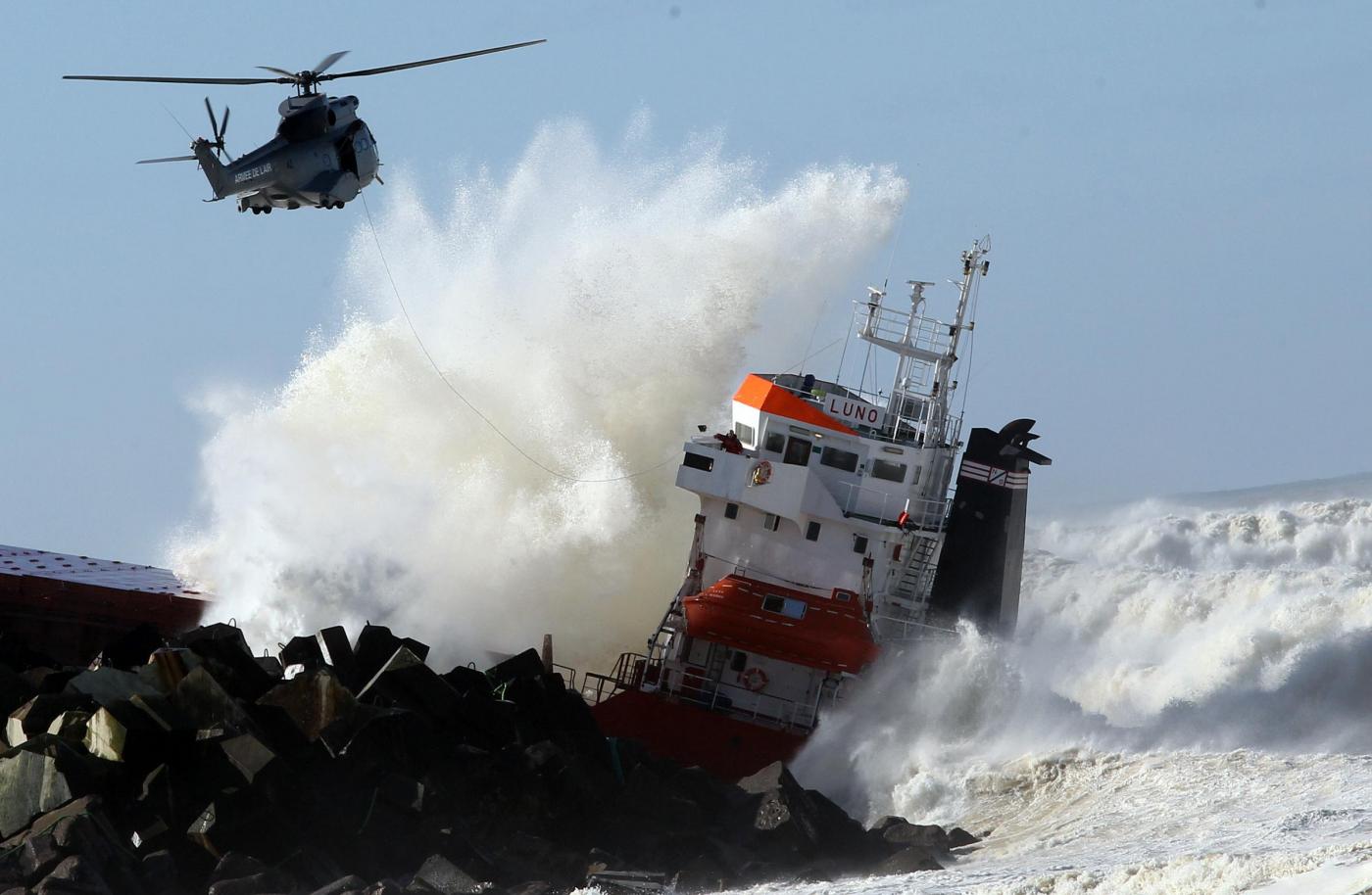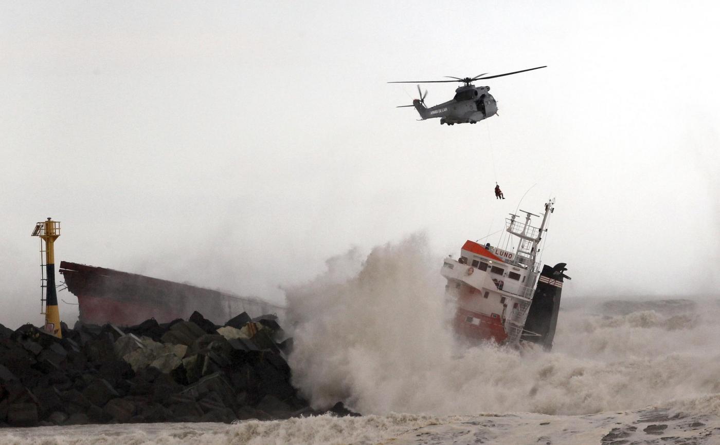 L’equipaggio della Luno, una nave da carico battente bandiera spagnola con 11 marinai a bordo più il capitano, dopo essersi arenata si è spezzata nei pressi della spiaggia di Anglet.