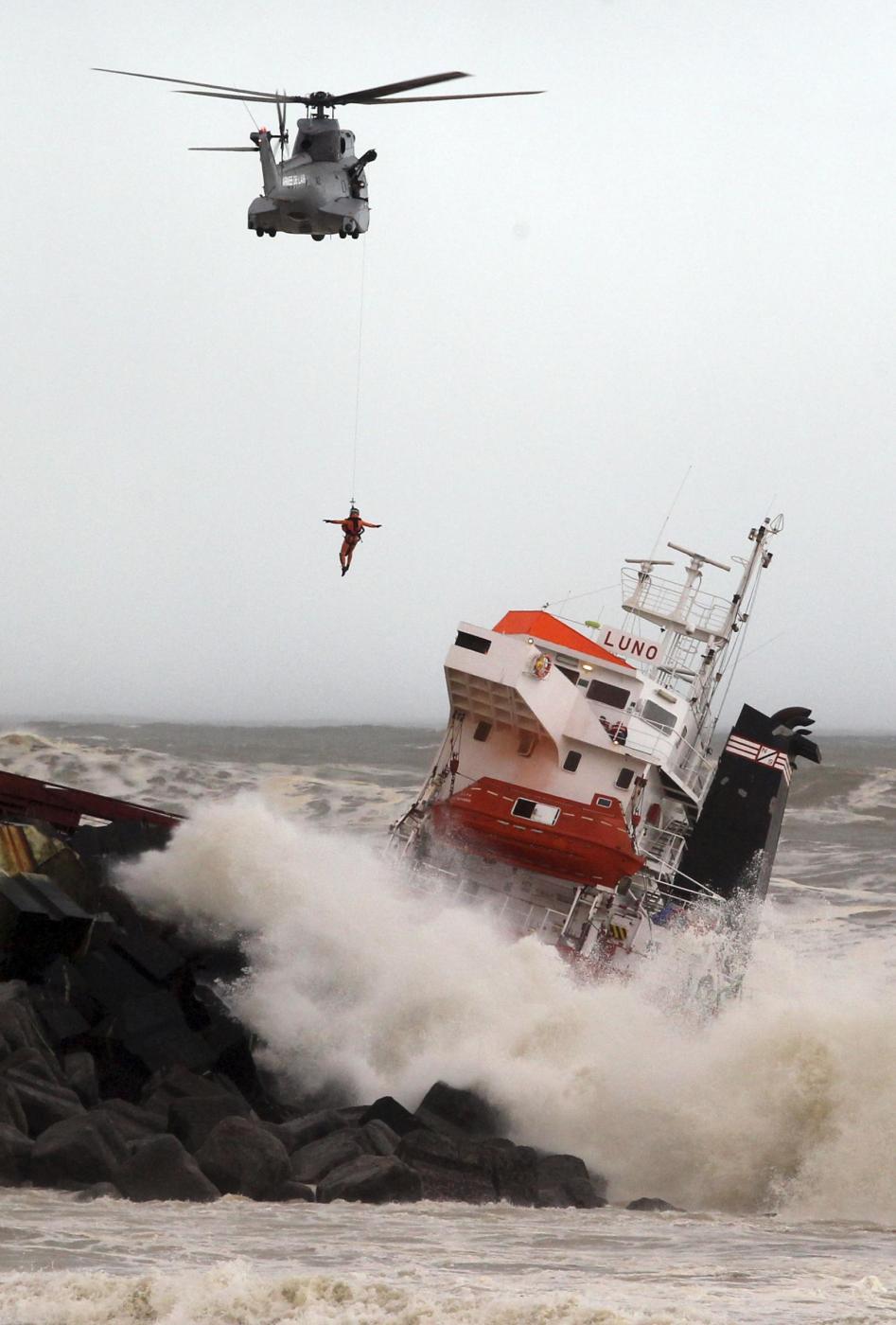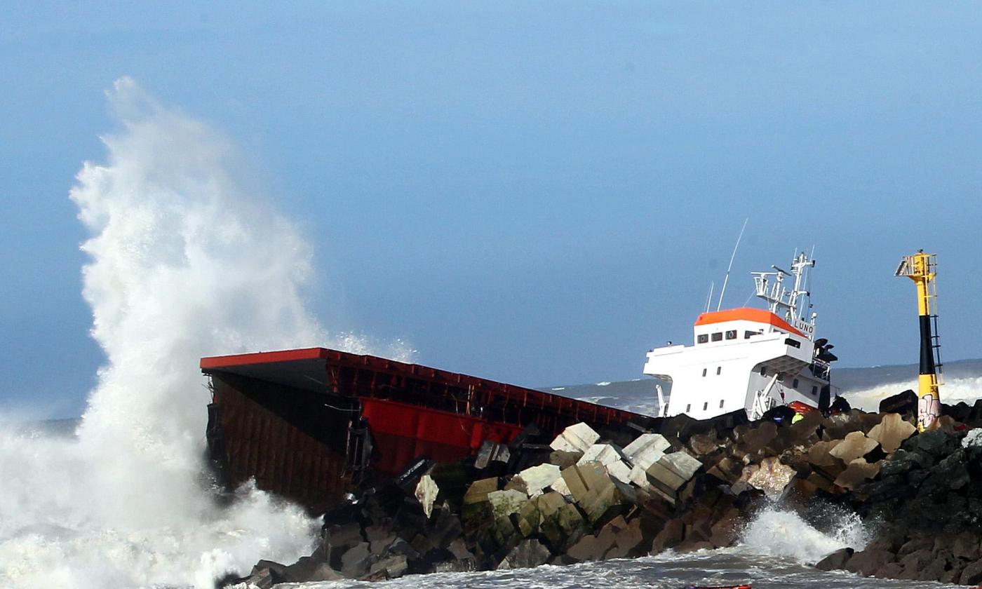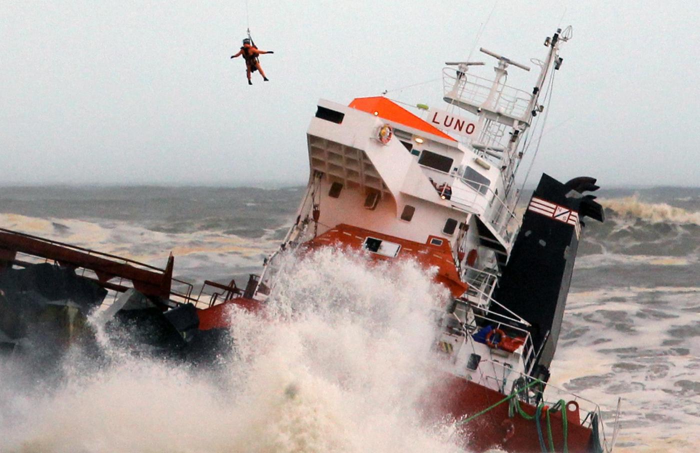 L’equipaggio della Luno, una nave da carico battente bandiera spagnola con 11 marinai a bordo più il capitano, dopo essersi arenata si è spezzata nei pressi della spiaggia di Anglet.