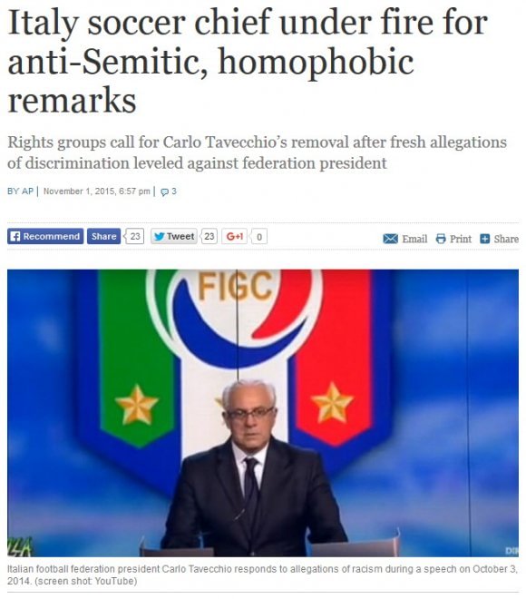 La somiglianza effettivamente c’è, ma l’errore è clamoroso. Chissà cosa penserà Crozza, la cui popolarità a volte super anche quella delle persone che imita. Carlo Tavecchio è stato registrato durante un colloquio: il presidente della Fgci, dopo aver dato nel 2014 dei “mangia banane” a giocatori più o meno sconosciuti di colore, questa volta è scivolato su ebrei e omosessuali. E il “Time of Israel” nel dare la notizia accompagnando il pezzo con una foto di Crozza, nella didascalia della foto ha scritto: “Il presidente della federazione italiana Carlo Tavecchio risponde alle accuse di razzismo durante una conferenza stampa”. La conferenza di cui parla il giornale israeliano è quella indetta da Tavecchio a poche ore di distanza dalla diffusione dell’intervista alla rivista online Sportlife in cui parlava di “ebreacci” e in cui diceva che gli omosessuali è meglio “tenerli lontani”.