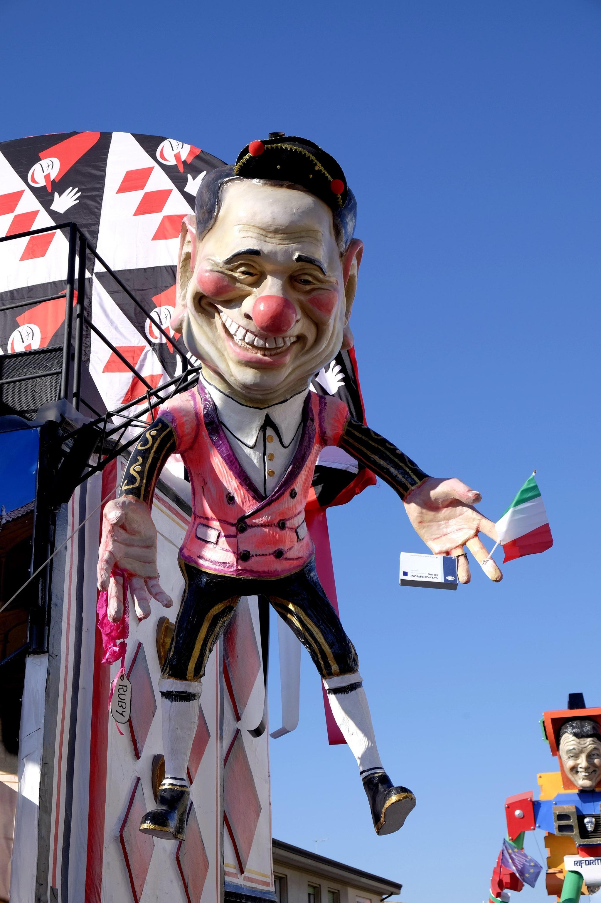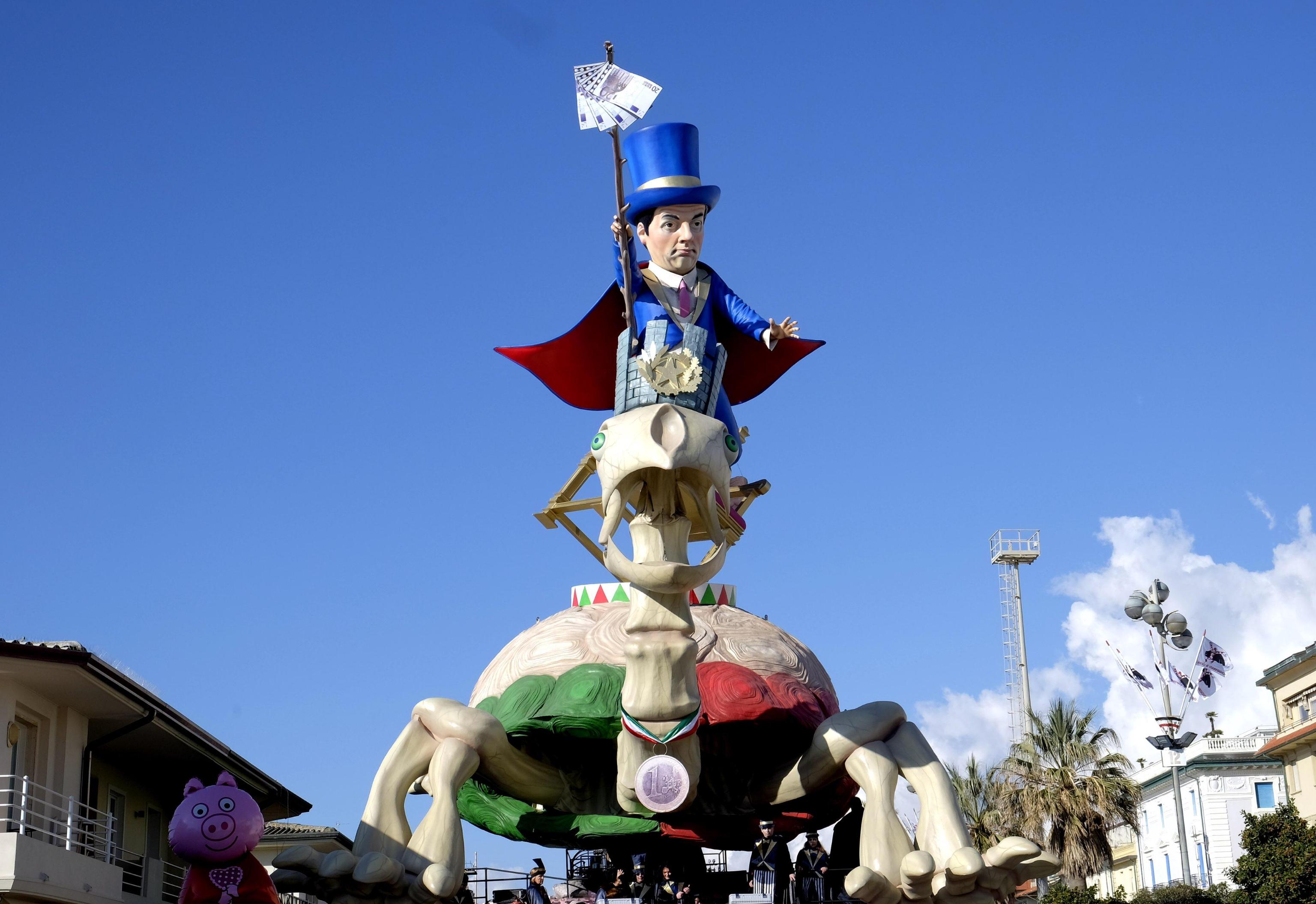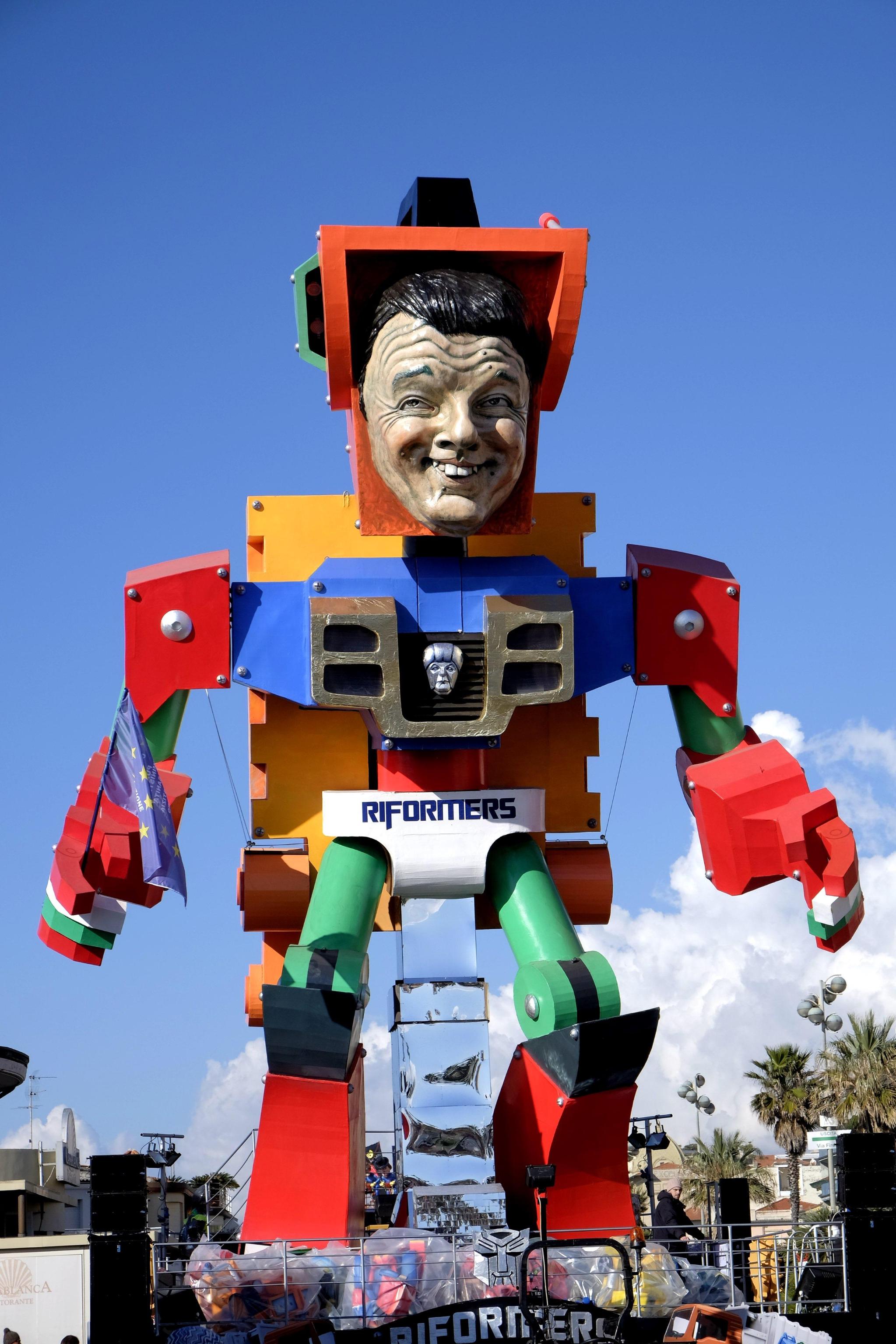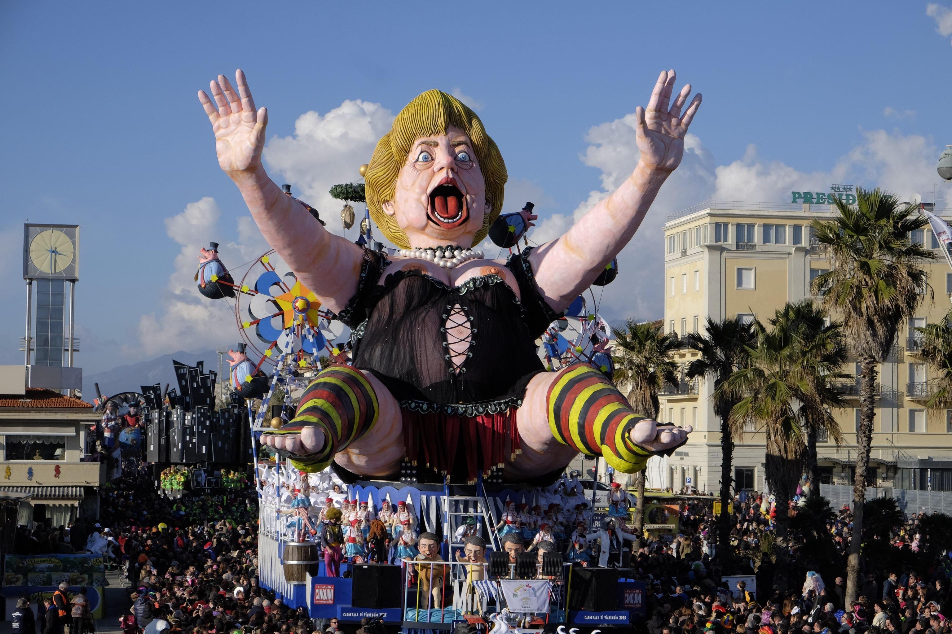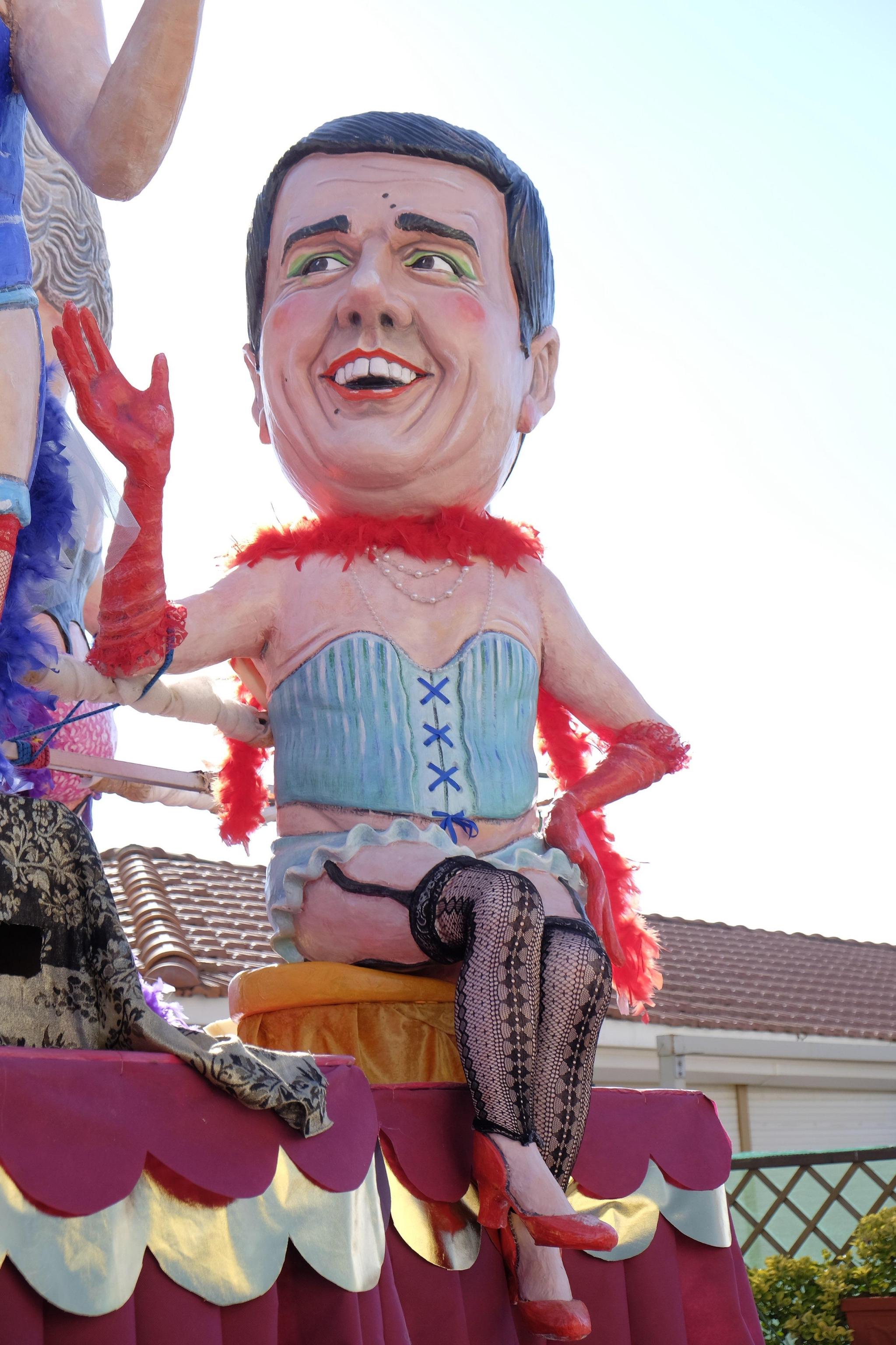 La star fra le varie costruzioni è stata comunque il premier Matteo Renzi, presente su quasi tutte le costruzioni che hanno scelto la satira politica come linguaggio principale. Un carro destinato a far discutere è quello dedicato ad Angela Merkel, con indosso una sorta di guepiere che lascia maliziosamente scoperto il teutonico seno: la cancelliera è raffigurata in una grande sala parto e dà alla luce tanti piccoli e irriverenti Renzi sul carro di Umberto e Stefano Cinquini.