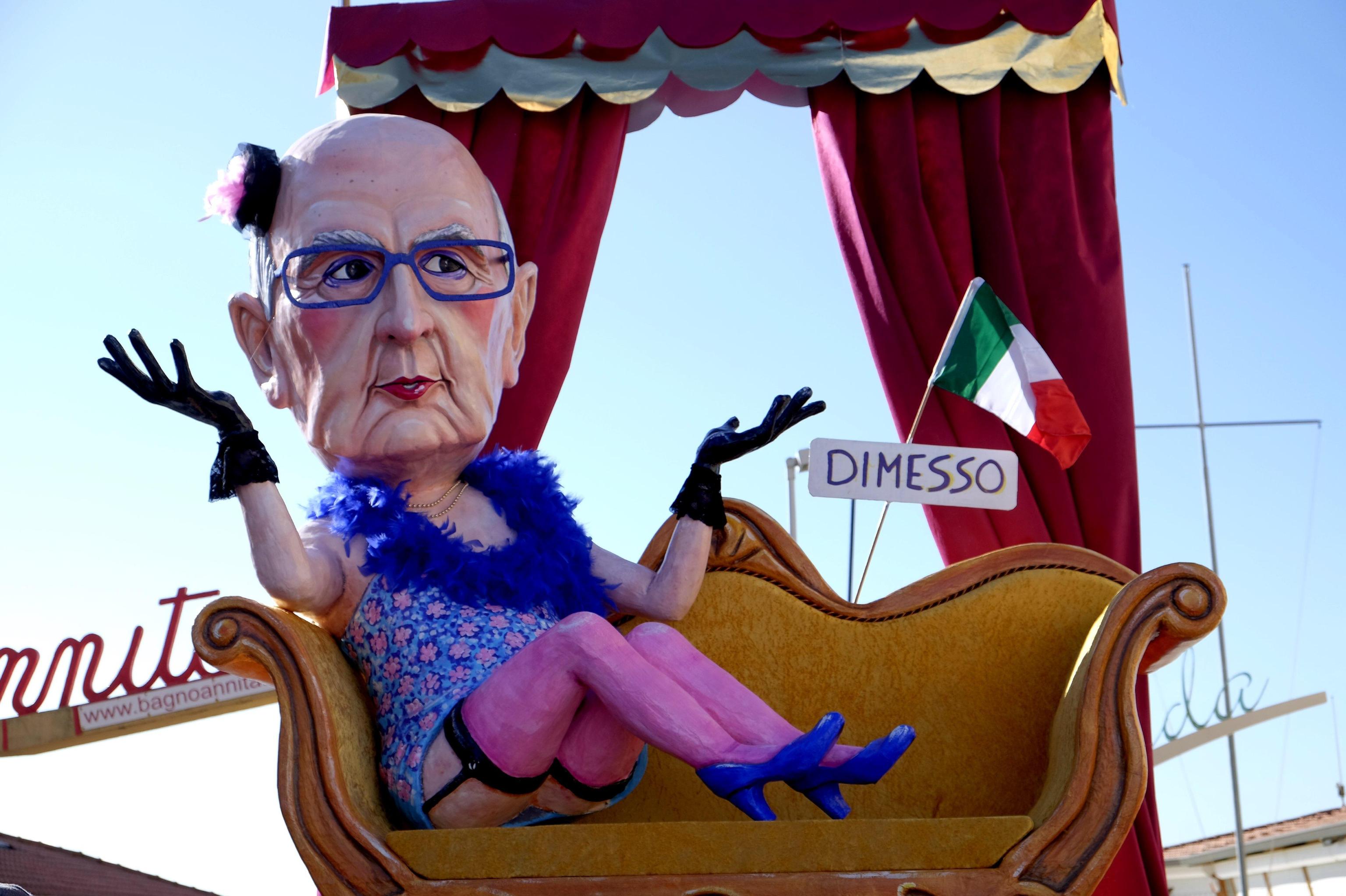 VIAREGGIO – Ha sfilato anche il neo Capo dello Stato Sergio Mattarella, anche se solo in foto data la mancanza di tempo per dedicargli una maschera di cartapesta, al primo corso del Carnevale di Viareggio, svoltosi questo pomeriggio nella cittadina versiliese. In onore del Presidente della Repubblica suonato anche l’inno di Mameli prima dell’inizio della sfilata sui viali a mare, baciati da un sole che ha favorito una buona partecipazione di pubblico al Carnevale edizione 2015. Mattarella in foto è apparso in una mascherata isolata, il suo predecessore Giorgio Napolitano è comparso con la scritta ‘dimesso’ oltre che in pantofole da buon pensionato che guarda in tivù il teatrino della politica.