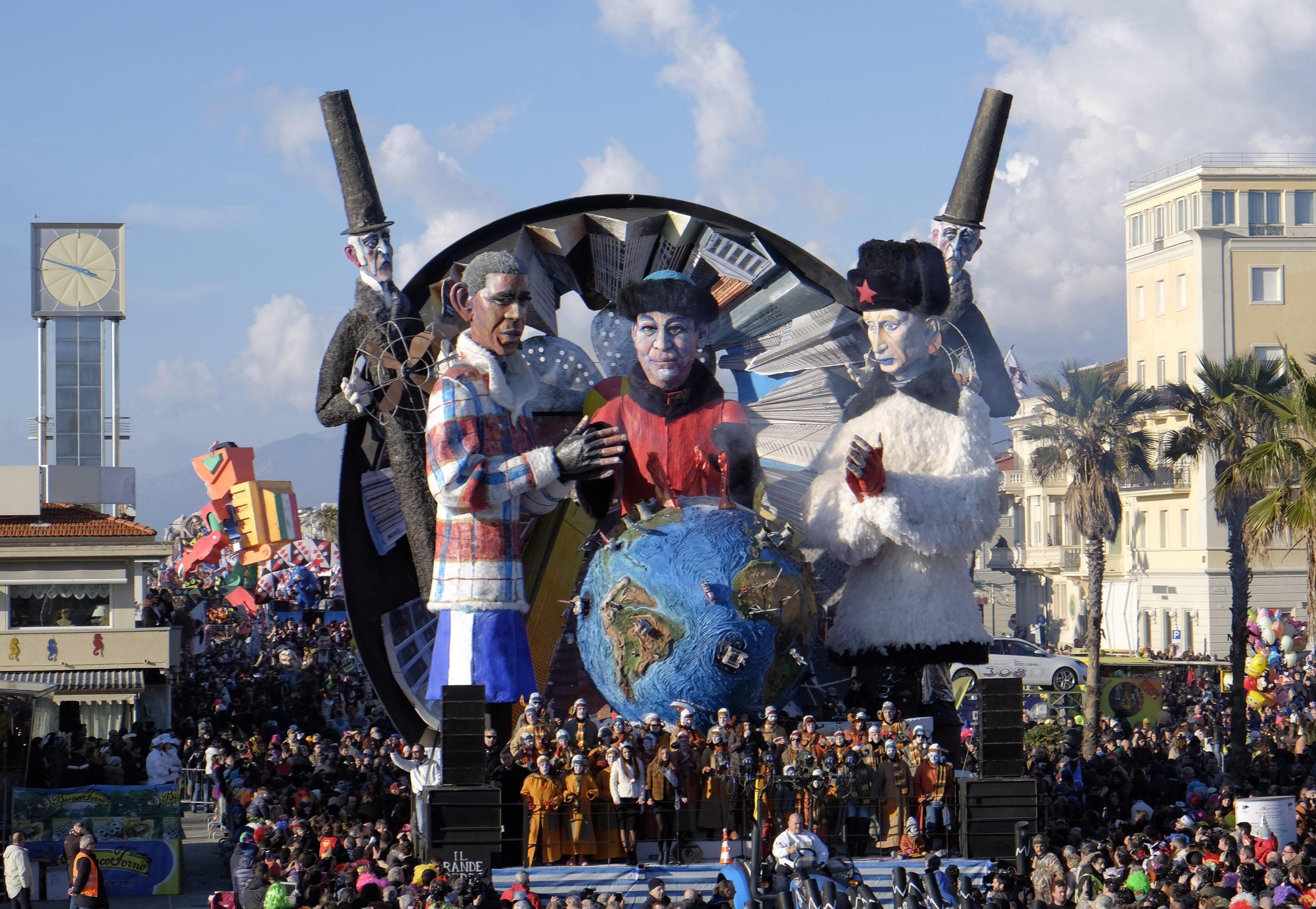 I costruttori viareggini hanno preso di mira anche i grandi della terra da Obama a Putin a Xi Jinping, e ha debuttato anche Papa Francesco, protagonista in due mascherate: in una il Pontefice veste i panni del cuoco rottamatore insieme a Matteo Renzi ai fornelli di un padiglione dell’Expo, nell’altra è paladino degli omosessuali sorretto sulle spalle da un Vladimir Putin a cui spetta il ruolo del pregiudizio.