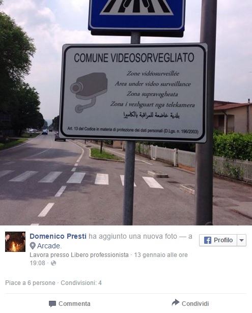 ARCADE (TREVISO) – Arcade (Treviso): cartelli antiladri in arabo, rumeno e albanese in strada. L’idea di mettere in guardia in questo modo i malintenzionati è venuta a Domenico Presti, sindaco leghista di questo paese che sorge in provincia di Treviso. Lo scopo sarebbe quello di mettere in guardia i malintenzionati e sono stati redatti all’ingresso del comune. C