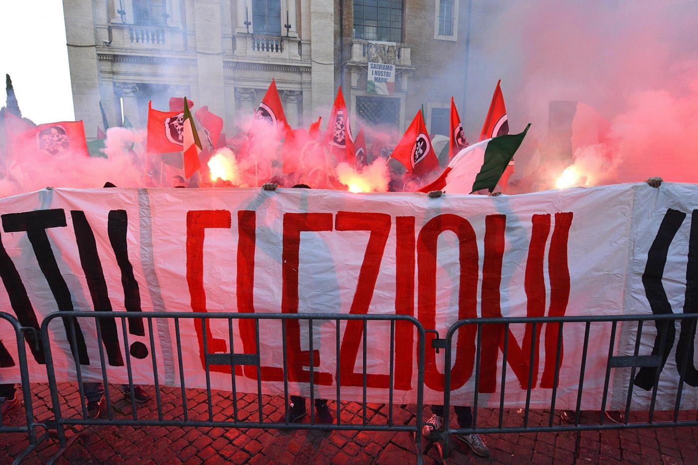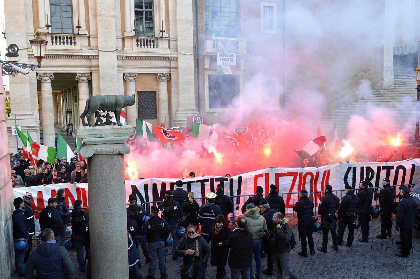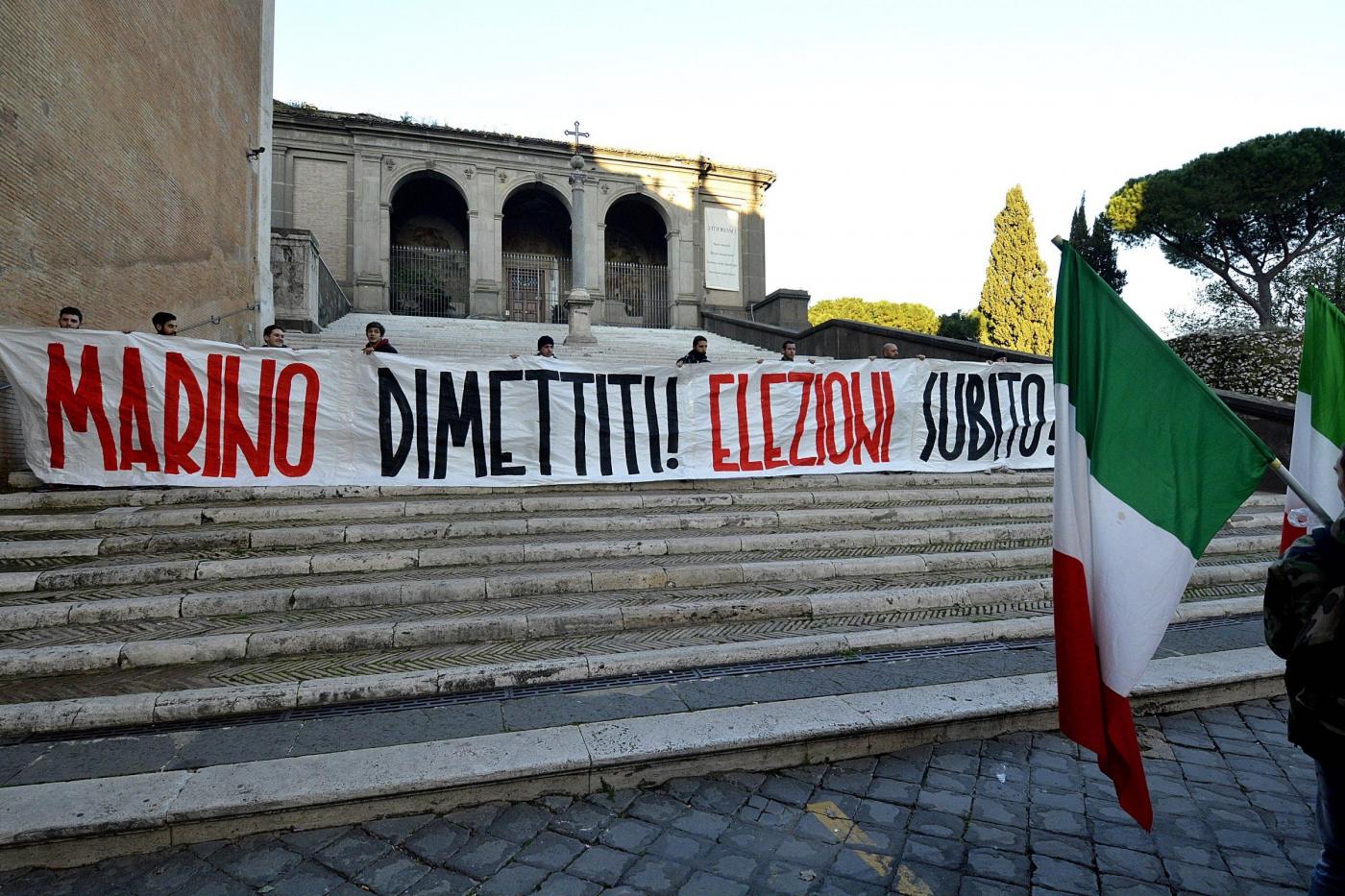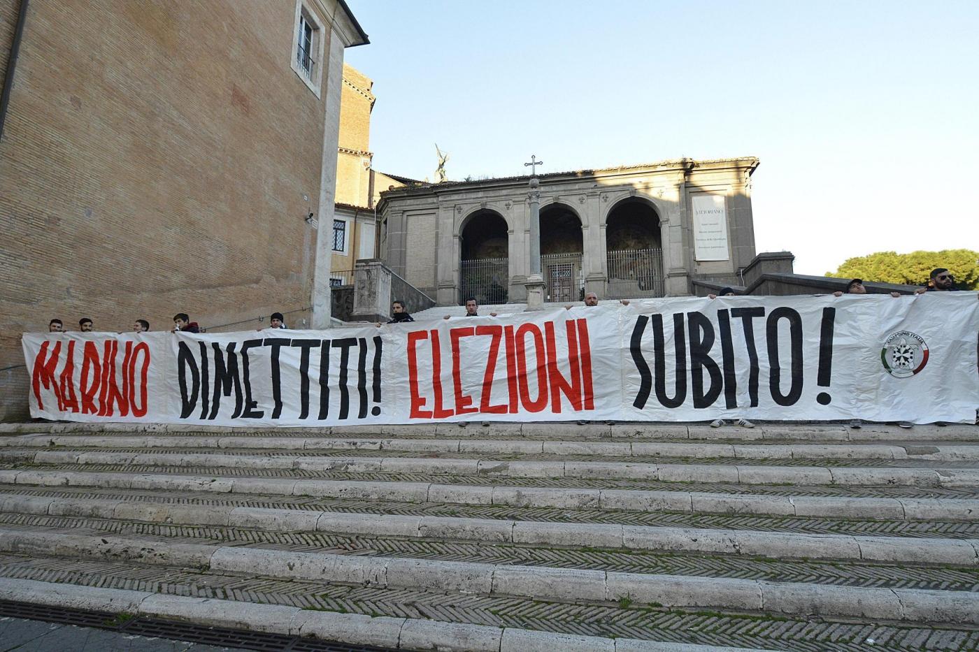ROMA – “Marino dimettiti! Elezioni subito!”: Casapound protesta contro il sindaco di Roma Ignazio Marino con fumogeni, striscioni e cori sotto il Campidoglio. Alcune decine di manifestanti hanno più volte urlato “Mafia, degrado, immigrazione questi i nemici della nazione”. Dopo aver affisso in tutti i quartieri di Roma, nella notte, lo striscione portato anche sotto la sede del Comune che invitava il sindaco alle dimissioni, Casapound ha indicato nel sindaco, nel Pd e nelle cooperative i colpevoli del pesante quadro di corruzione venuto fuori dall’inchiesta sul “Mondo di Mezzo”.