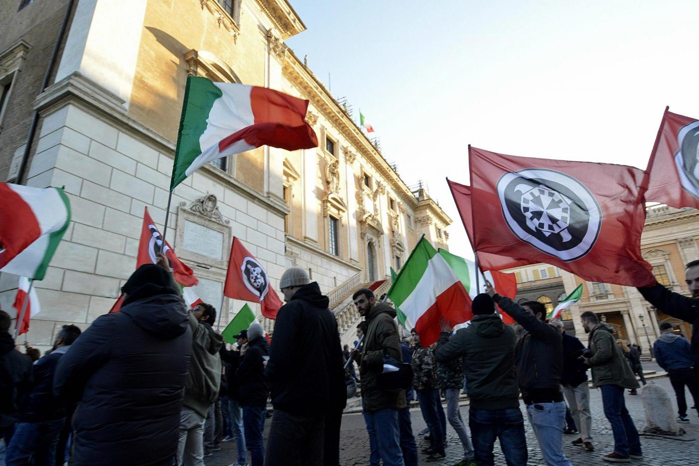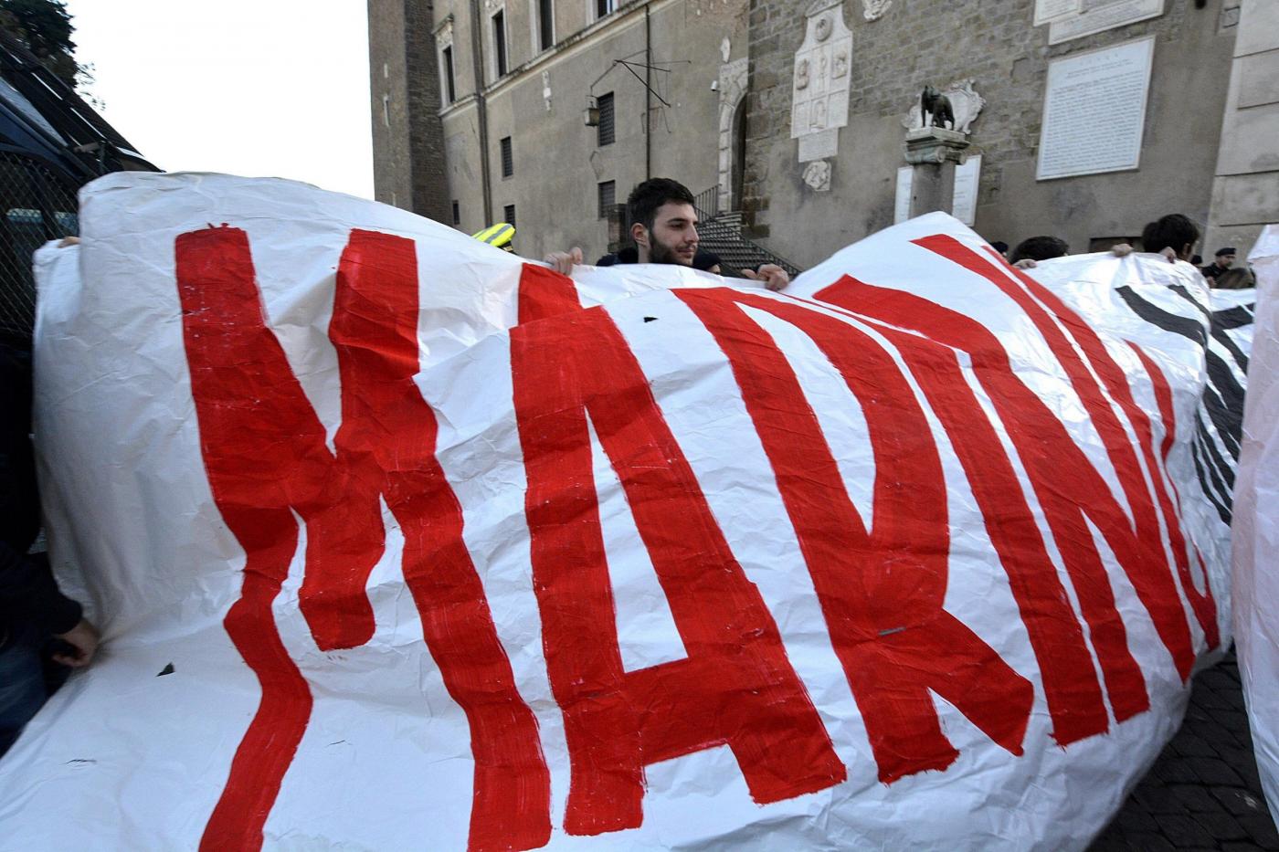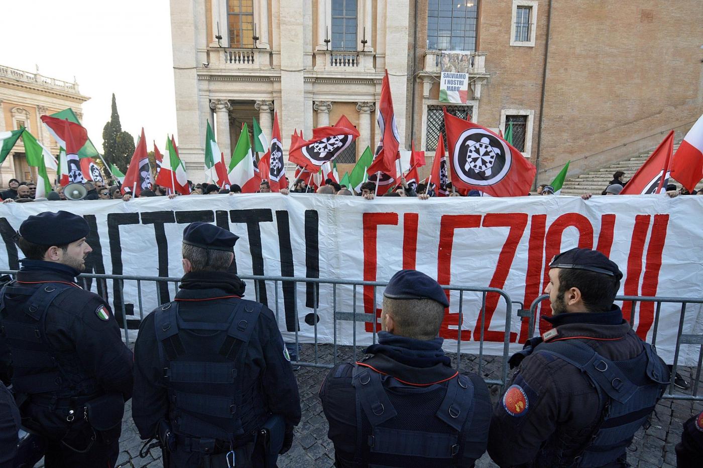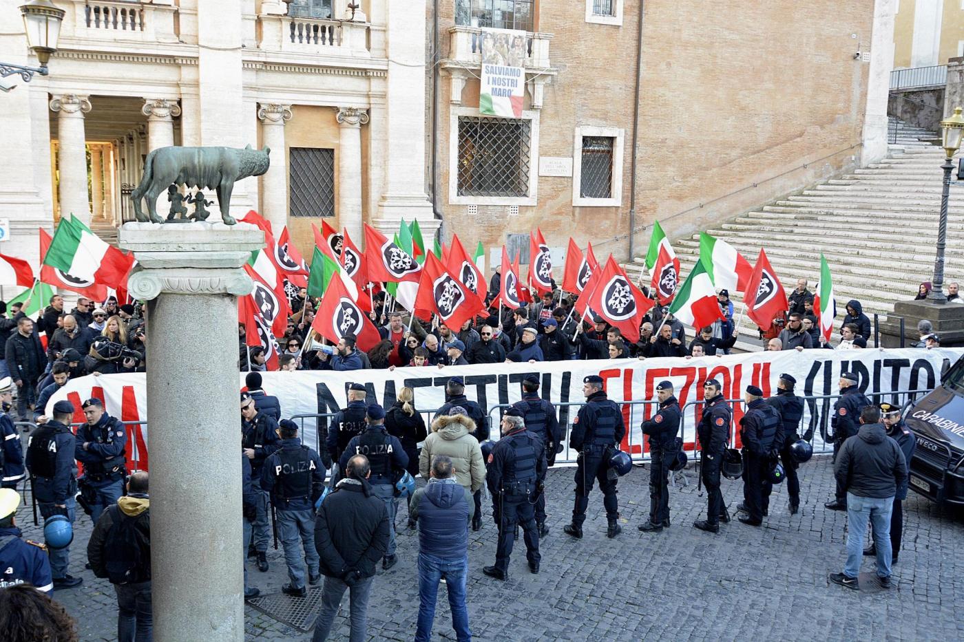 ROMA – “Marino dimettiti! Elezioni subito!”: Casapound protesta contro il sindaco di Roma Ignazio Marino con fumogeni, striscioni e cori sotto il Campidoglio. Alcune decine di manifestanti hanno più volte urlato “Mafia, degrado, immigrazione questi i nemici della nazione”. Dopo aver affisso in tutti i quartieri di Roma, nella notte, lo striscione portato anche sotto la sede del Comune che invitava il sindaco alle dimissioni, Casapound ha indicato nel sindaco, nel Pd e nelle cooperative i colpevoli del pesante quadro di corruzione venuto fuori dall’inchiesta sul “Mondo di Mezzo”.