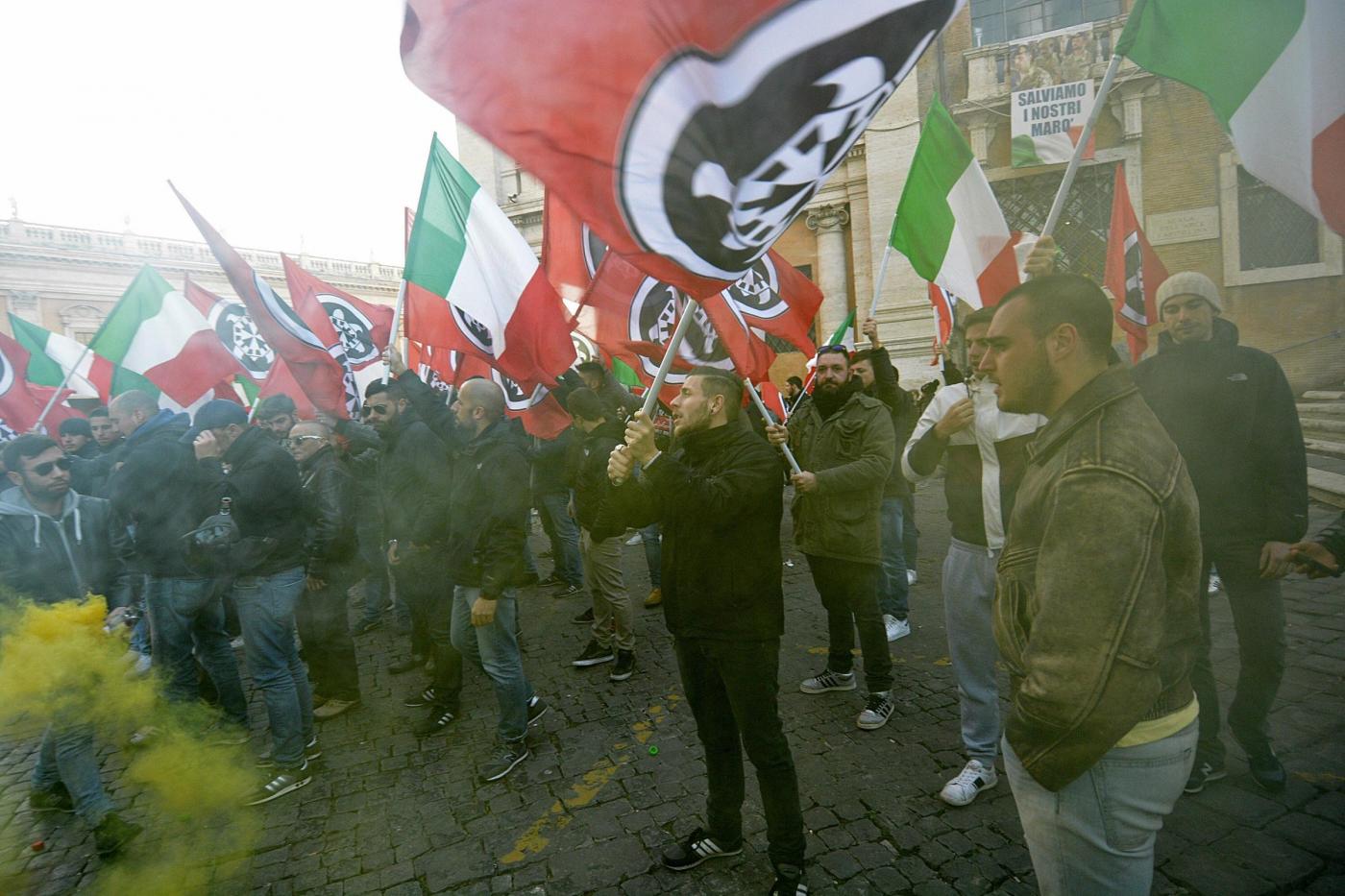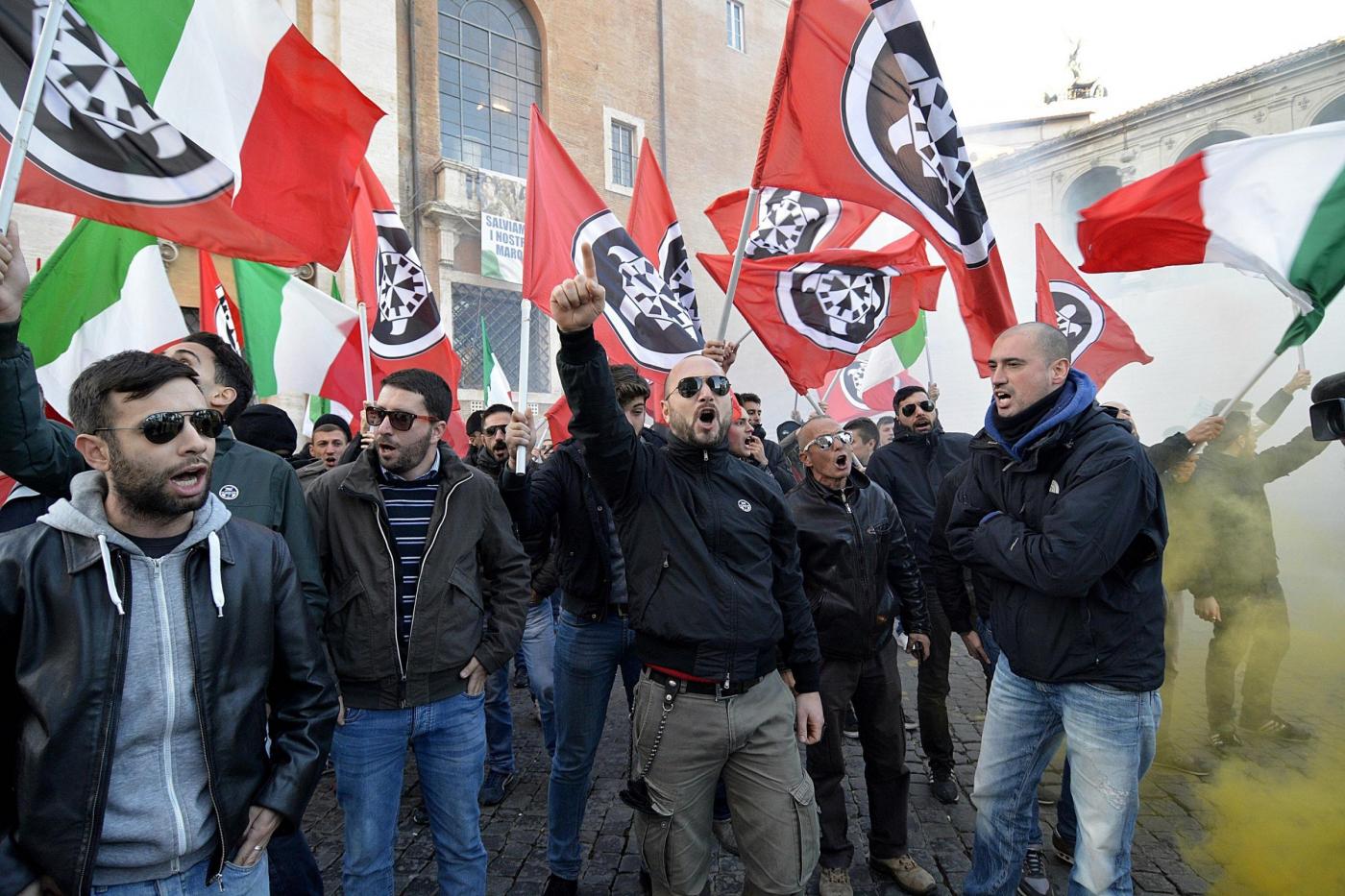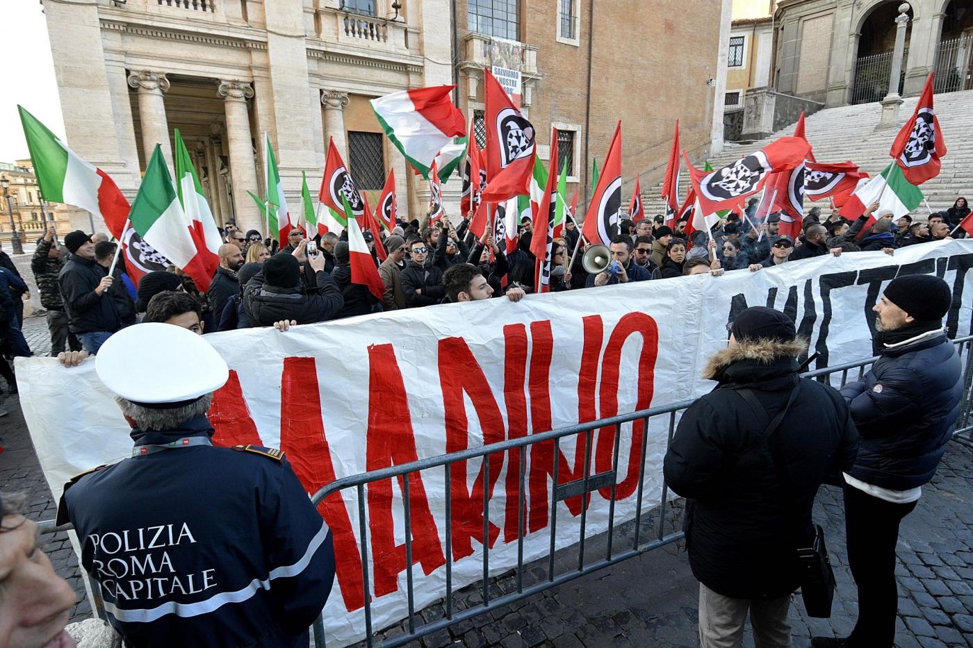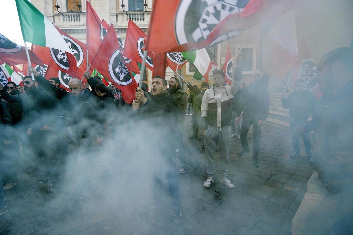 ROMA – “Marino dimettiti! Elezioni subito!”: Casapound protesta contro il sindaco di Roma Ignazio Marino con fumogeni, striscioni e cori sotto il Campidoglio. Alcune decine di manifestanti hanno più volte urlato “Mafia, degrado, immigrazione questi i nemici della nazione”. Dopo aver affisso in tutti i quartieri di Roma, nella notte, lo striscione portato anche sotto la sede del Comune che invitava il sindaco alle dimissioni, Casapound ha indicato nel sindaco, nel Pd e nelle cooperative i colpevoli del pesante quadro di corruzione venuto fuori dall’inchiesta sul “Mondo di Mezzo”.