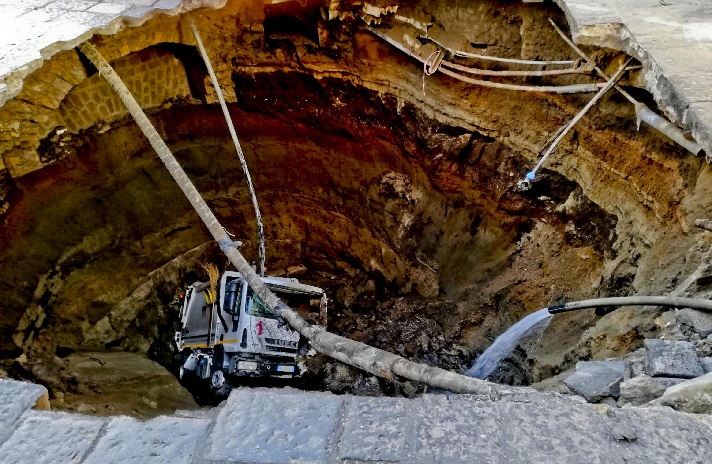 Napoli, voragine davanti alla Basilica di San Mauro: dentro ci precipita un camion dei rifiuti