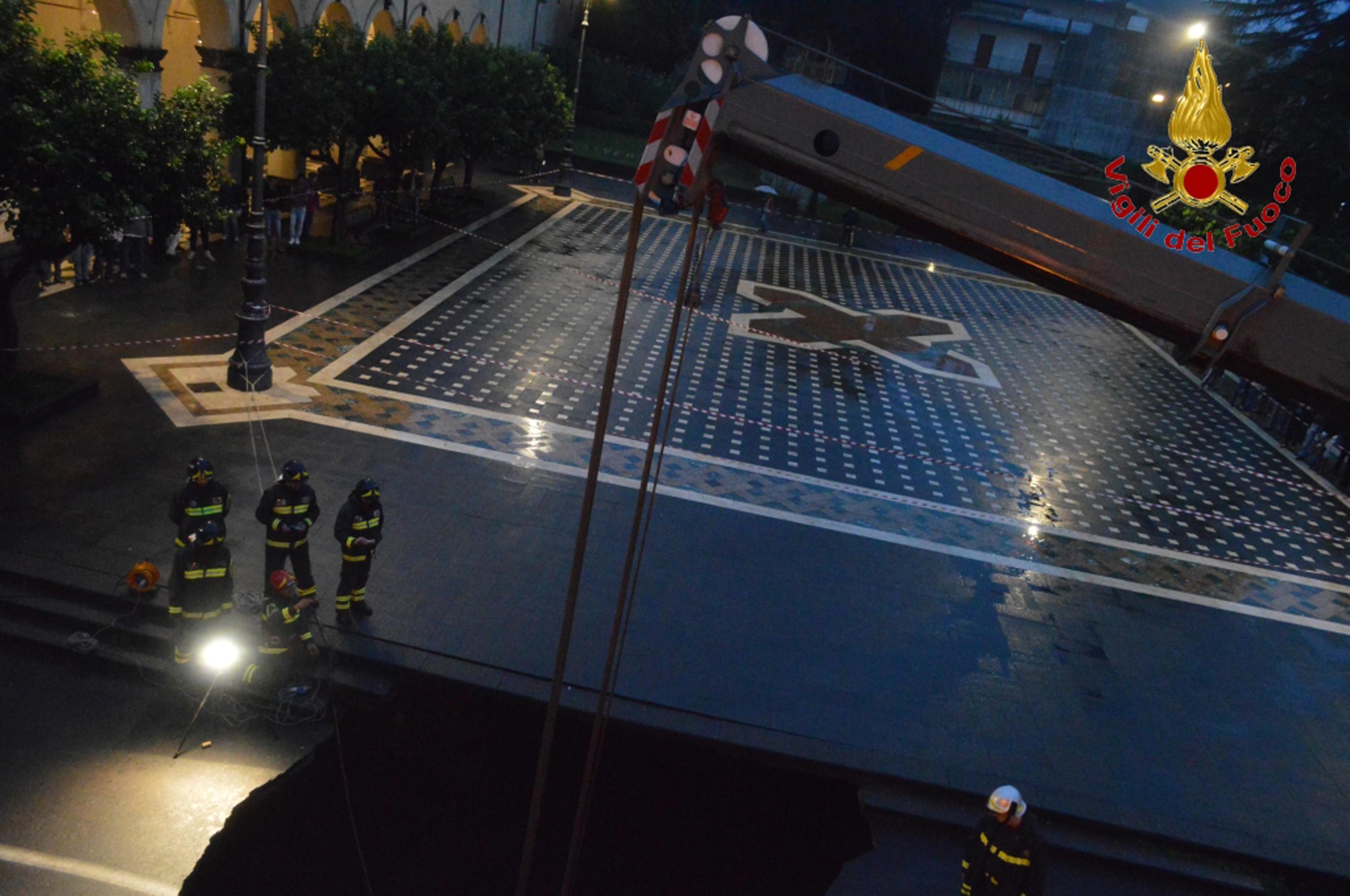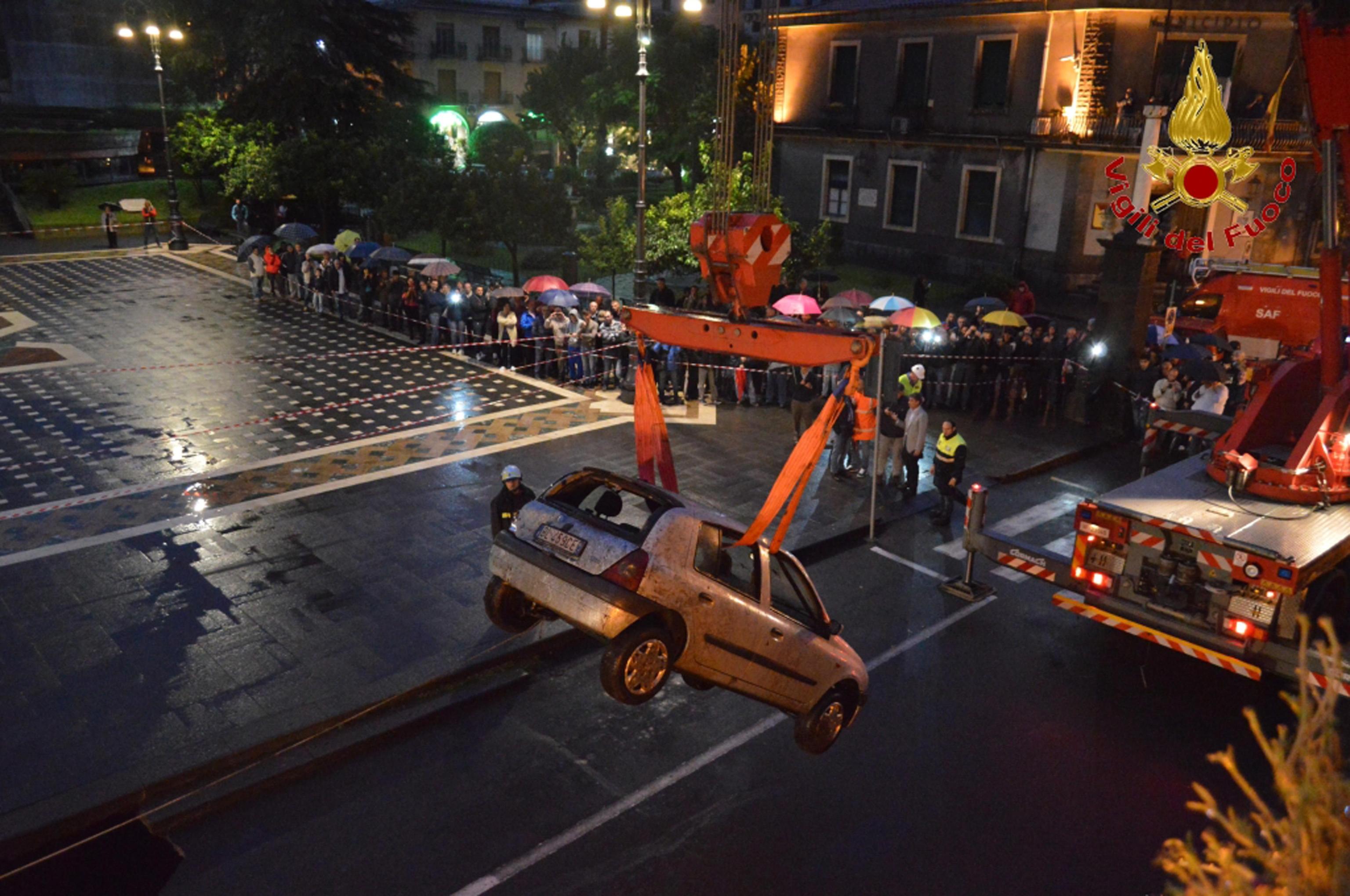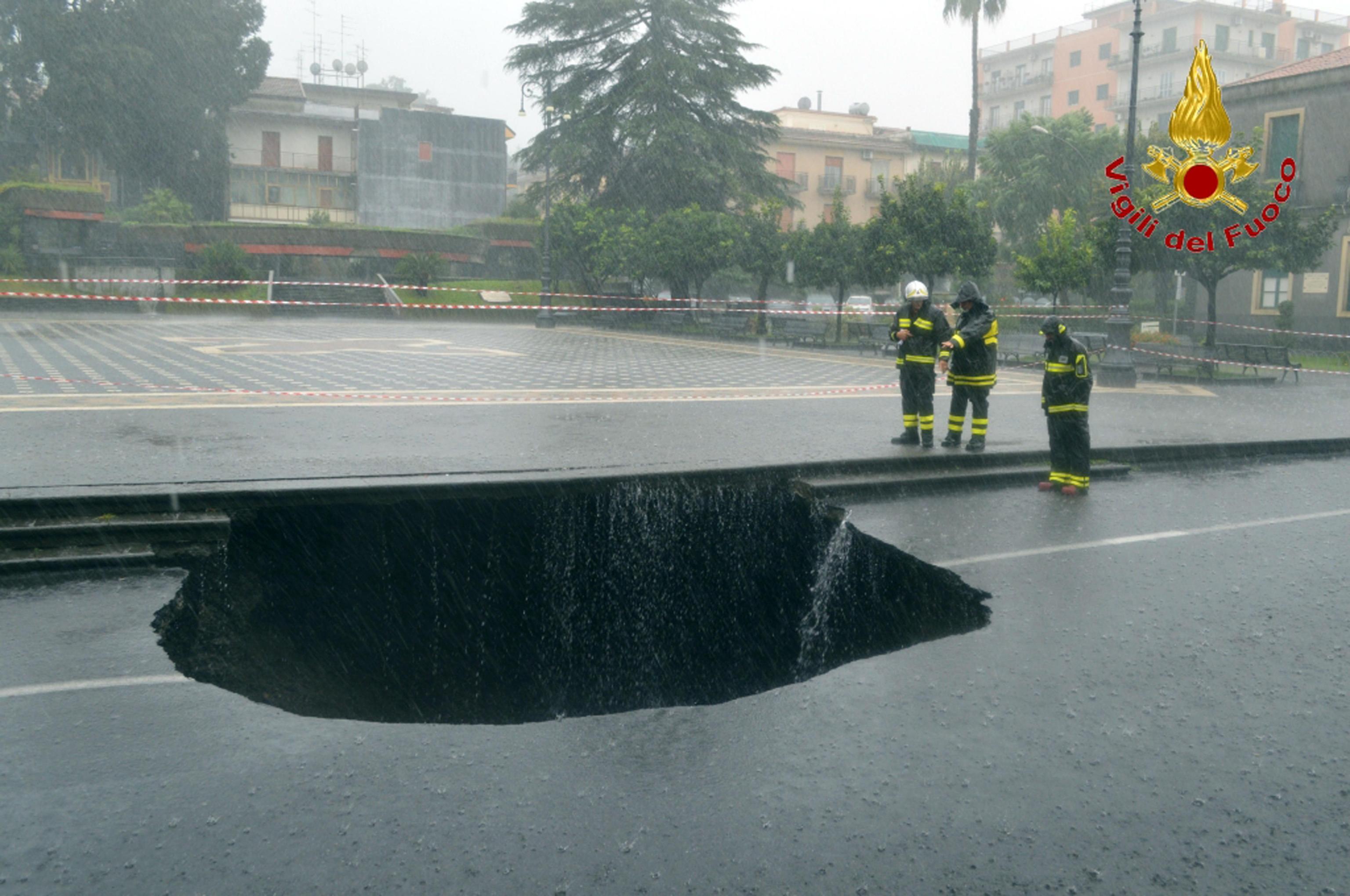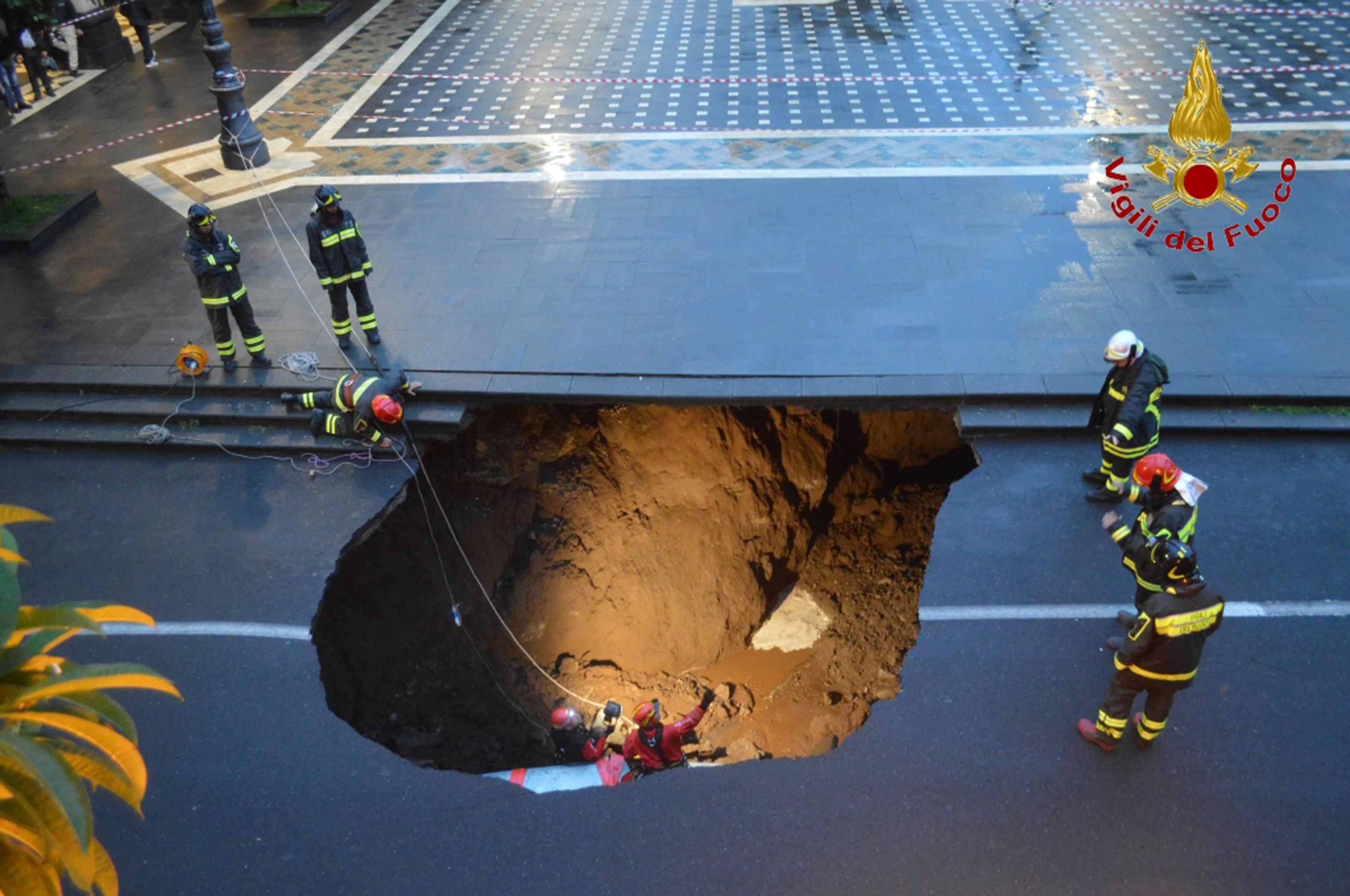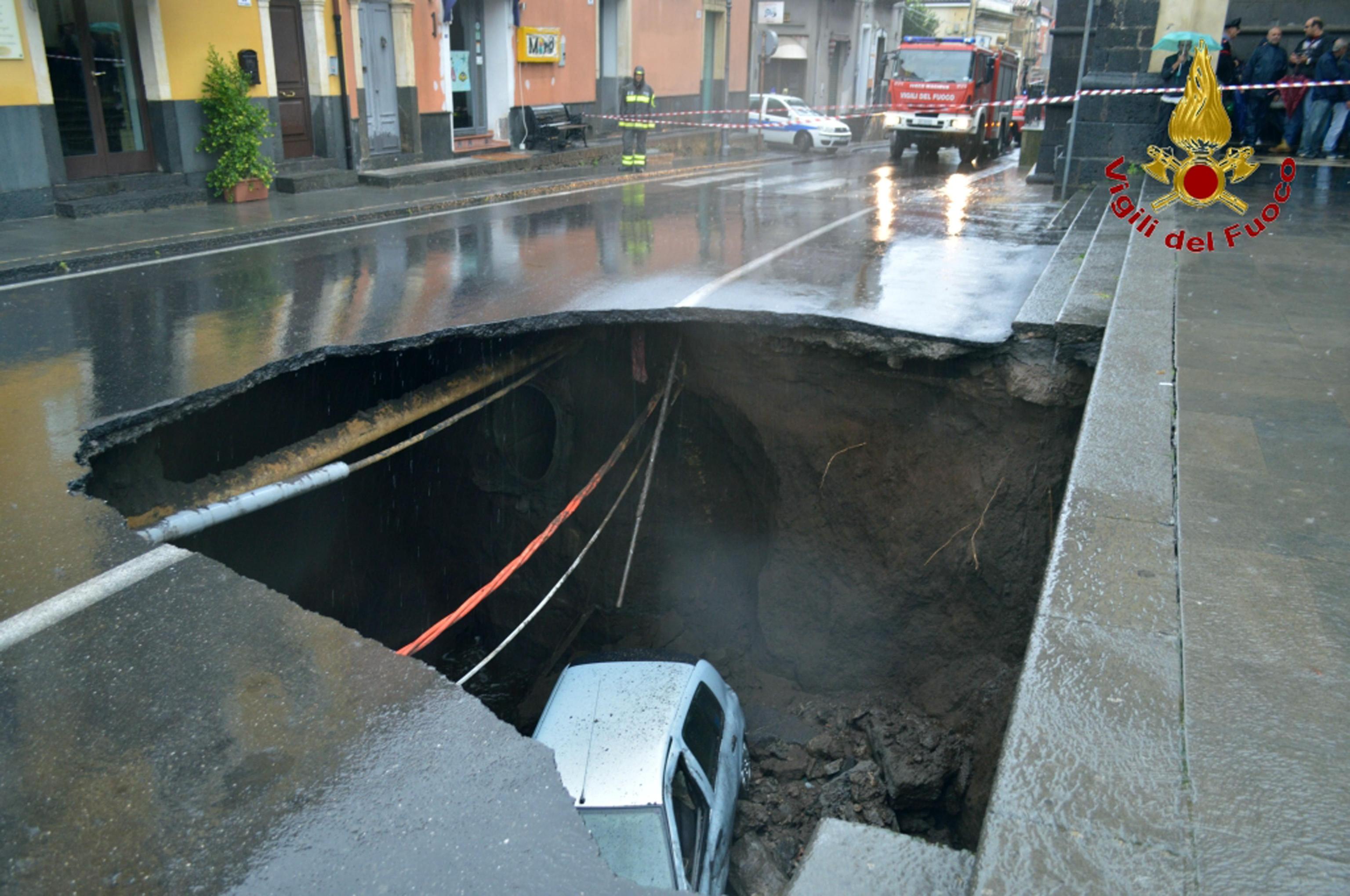 CATANIA A causa delle intense precipitazioni di mercoledì 21 ottobre, nella piazza principale di Valverde in provincia di Catania, si è aperta una voragine del diametro di circa otto metri di diametro ed altrettanto profonda, facendovi precipitare dentro un’automobile, per fortuna senza nessuno a bordo. I Vigili dei fuoco sono intervenuti per recuperare la vettura e mettere in sicurezza la zona, che è transennata. I pompieri hanno accertato che un’ampia zona della piazza è pericolante a causa di erosioni causate da infiltrazioni d’acqua.