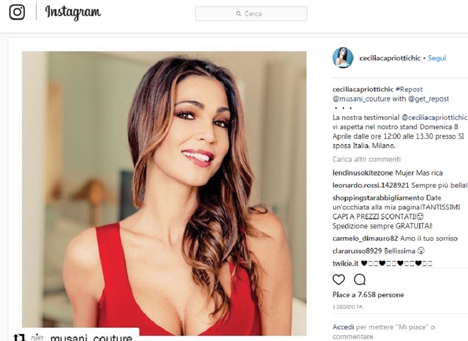 La conferma arriva proprio dal profilo social di Instagram di Cecilia Capriotti che posta uno scatto pubblicato da un Musani Couture con la didascalia: “La nostra testimonial @ceciliacapriottichic vi aspetta nel nostro stand Domenica 8 Aprile dalle ore 12:00 alle 13.30 presso SI sposa Italia, Milano”.