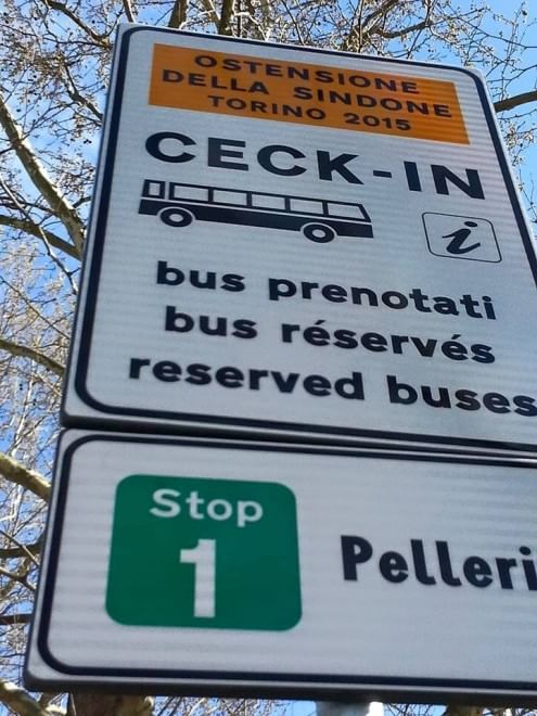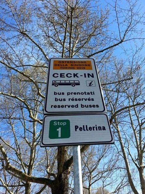 TORINO – L’Ostensione della Sindone comincerà il 19 aprile e terminerà il 24 giugno. La città si prepara e come spesso accade in questi momenti la fretta gioca brutti scherzi. In città iniziano infatti a comparire i cartelli che dovranno dare indicazioni a pellegrini e turisti. Al parco della Pellerina verranno parcheggiati i pullman e qui si scivola sull’inglese.