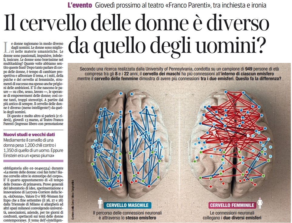 E’ giusto partire con un’ammissione. Sì, le donne hanno il cervello più piccolo e leggero. Non è un mistero. Gli scienziati lo hanno misurato: il cervello medio di una donna pesa 1,200 chilogrammi contro 1,350 kg di quello maschile. Eppure anche Albert Einstein aveva un cervello—piuma, e nessuno direbbe che funzionava meno bene perché aveva un volume minore. […] Ben aldilà di massa e volume, quello che conta sono le connessioni, o sinapsi, fra i neuroni. Solo da alcuni anni, grazie alle nuove tecniche di imaging (come la risonanza magnetica) gli scienziati sono riusciti ad entrare in un cervello vivo, vitale, e hanno iniziato a capire come funziona questa straordinaria macchina.