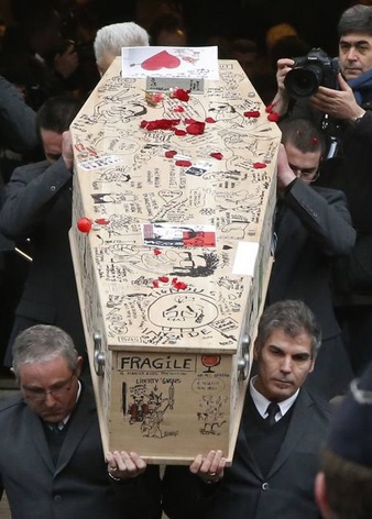 PARIGI – Una settimana dopo il massacro nella loro redazione, si sono svolte tra ieri ed oggi le esequie dei vignettisti e collaboratori del settimanale Charlie Hebdo. Ieri (giovedì 15 gennaio) sono stati inumati con cerimonie private due dei caricaturisti più emblematici del periodico: dopo Cabu, il padre di “beauf” (lo stereotipo del conservatore francese della classe media), interrato mercoledì 14, è stata la volta dell’addio a Wolinski che è stato cremato a Pere-Lachaise, e Tignous, seppellito nella stesso cimitero parigino dopo una cerimonia nel comune di Montreuil. L’urna con le ceneri di Wolinski, disegnatore dall’immaginazione fertile e corrosiva, è stata inumata nel pomeriggio nel cimitero di Montparnasse.