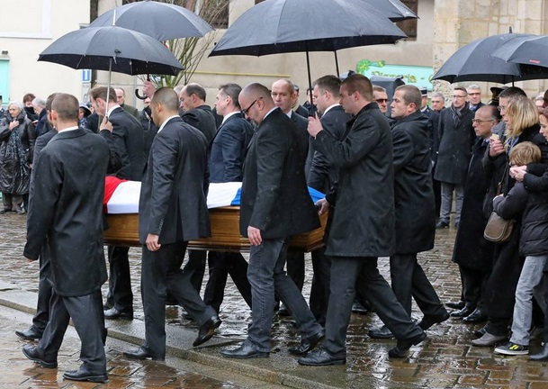 Sempre ieri ci sono state anche le esequie nell’intimità familiare dell’economista Bernard Maris e quelle a Montparnasse della psichiatra Elsa Cayat, che aveva una rubrica che usciva due volte al mese sul settimanale. Oggi infine, si sono svolti anche i funerali di Franck Brinsolaro, il poliziotto ucciso nella redazione. La cerimonia si è svolta alle 11 con una cerimonia nella chiesa di Sainte-Croix di Bernay, a cui non è stata ammessa la stampa.