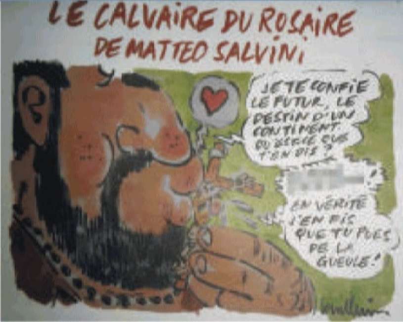 Charlie Hebdo sfotte Salvini col rosario facendo bestemmiare Gesù