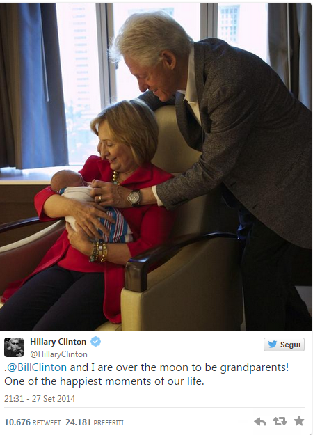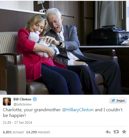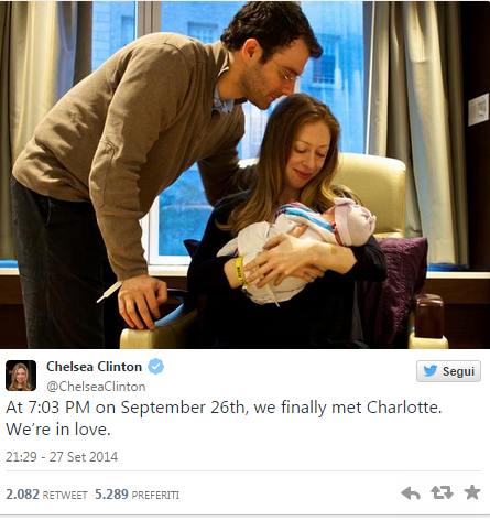 ROMA – La sua nascita non è paragonabile a quella del royal baby britannico, però negli Stati Uniti la nascita di Charlotte, data alla luce dall’ex first daughter Chelsea Clinton, era abbastanza attesa. Per la gioia dell’ex presidente Bill che – fanno sapere parenti e amici – non sta nella pelle, impazzito dalla felicità. E per quella di Hillary che – fa notare qualcuno – potrebbe diventare non solo la prima presidente donna degli Stati Uniti, ma anche la prima nonna ‘Commander in Chief’.
