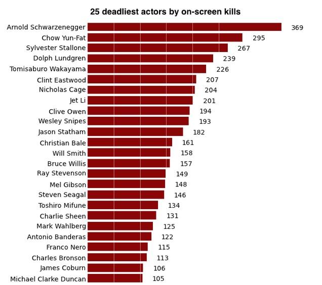 La classifica è di Randal Olson, il fondatore del sito MovieBodyCounts: nel portale le classifiche con gli attori che hanno ammazzato di più nel cinema e film con più morti. Qual è il film con più uccisioni? A sorpresa è Il Signore degli Anelli – Il ritorno del re con 863. Unico italiano nelle prime posizioni è Il buono, il brutto e il cattivo, il capolavoro di Sergio Leone, al 39° posto, poco sotto Rambo III.