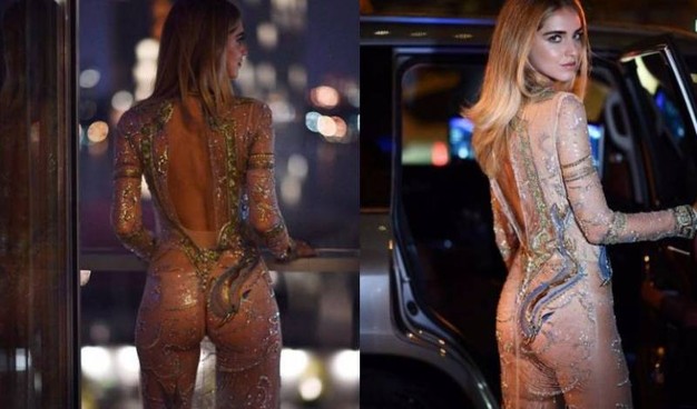 La Ferragni non è passata per nulla inosservata grazie al suo look provocante firmato da Roberto Cavalli, Si tratta di un abito lungo fino ai piedi con pietre e ricami, che lasciava ben poco all’immaginazione dato che era completamente trasparente. Sotto, la fashion blogger indossava un body color carne. Gli scatti sono stati postati su Instagram ed hanno fatto impazzire il pubblico della Rete.