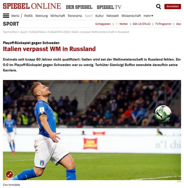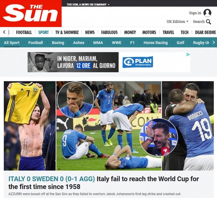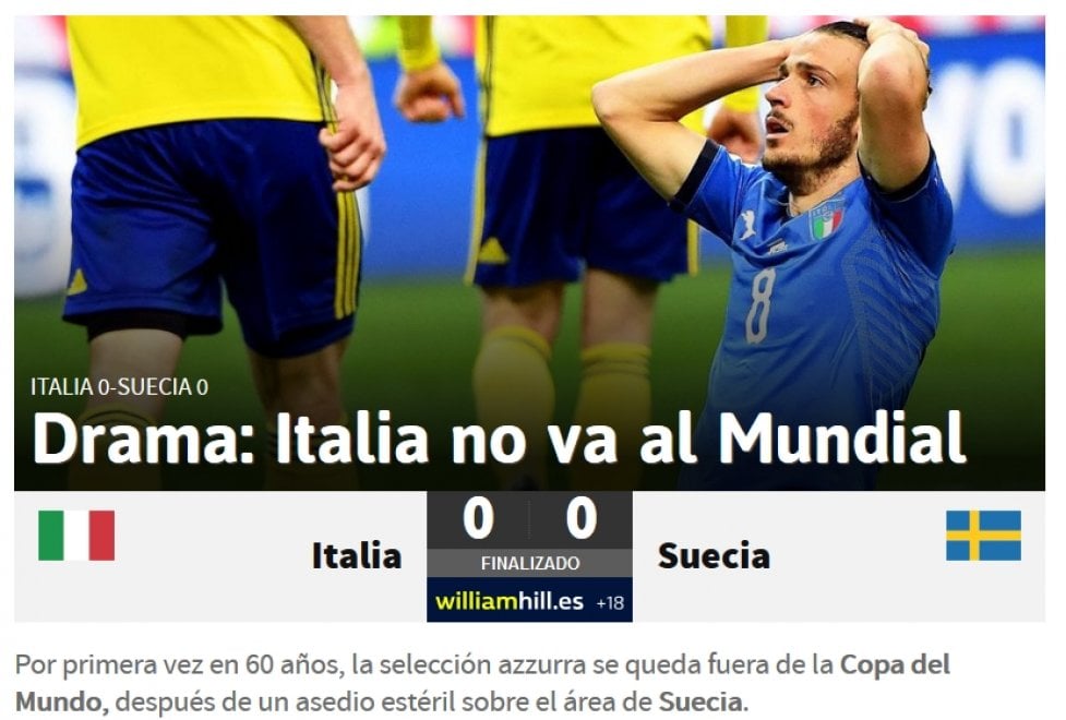 ROMA – Il giorno dopo la mancata qualificazione al Mondiale dell’Italia, i giornali sportivi e non, in Europa, non parlano d’altro. Francia, Spagna, Gran Bretagna, Portogallo e Inghilterra: i giornali di questi paesi salutano l’Italia che non parteciperà a Russia 2018.