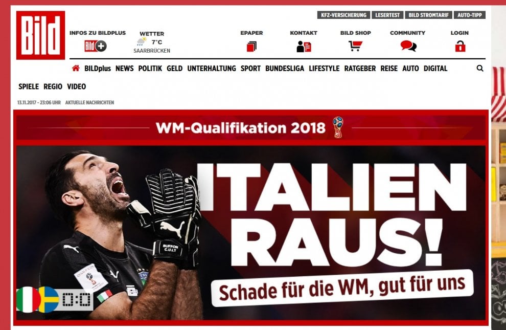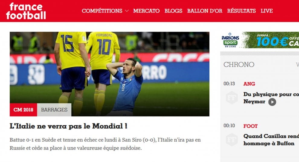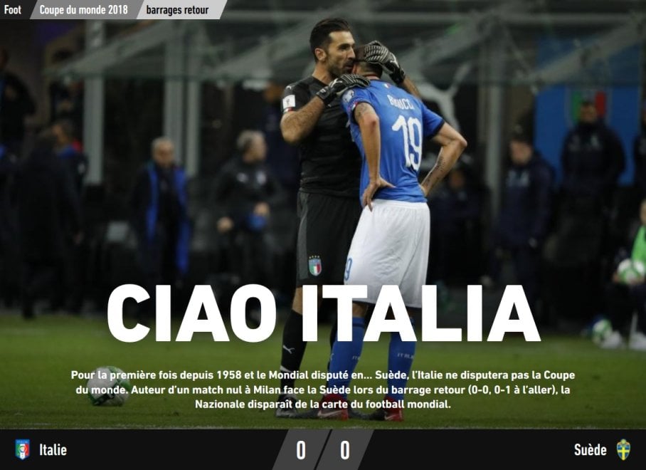 “Stupore, incredulità, ma anche un sospiro di sollievo per le altre grandi potenze calcistiche dal momento che l’Italia è sempre e comunque un avversario scomodo. Lo sanno bene i tedeschi e non è un caso che il quotidiano Bild scelga un “Italien Raus”, semplicemente “Italia fuori”, poi nel sottotitolo “peccato per il Mondiale, ma buon per noi”. Del resto la grande Germania ci ha sempre sofferto, nel 2016 in Francia la spuntò, ma ai rigori e soffrendo maledettamente. A proposito dei cugini transalpini, l’Equipe già nell’immediato dopo partita aveva scelto un eloquente “Ciao Italia”, ma anche oggi torna sulla clamorosa eliminazione degli azzurri addentrandosi sulle “ragioni di un fallimento”, proponendo anche le dichiarazioni e le scuse agli italiani di Ventura, ma anche la rassegna stampa dei nostri quotidiani.