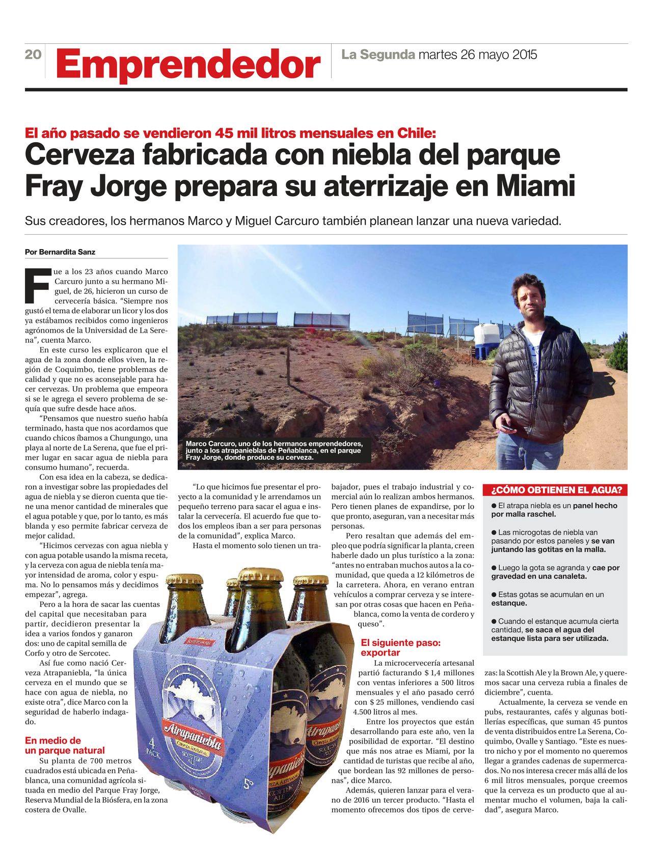Grazie a questa intuizione, nella cittadina di Pena Blanca è stato realizzato un birrificio la cui acqua viene fornita attraverso delle grandi reti con maglie strettissime che sono in grado di assorbire e raccogliere le piccole gocce d’acqua presenti nella nebbia. Il sistema è economico ed efficace ed ha permesso negli anni il recupero di terreni diventati inutilizzabili proprio a causa della carenza di acqua. E così, da un progetto nato per combattere la desertificazione, Marco y Miguel Carcuro hanno sviluppato un impianto artigianale che oggi arriva a produrre fino a 24mila litri di birra all’anno. Su Facebook alcune foto dell’impianto e dei tanti giornalisti anche italiani che in questi anni si sono recati sul posto per vedere da vicino il fnzionamento dell’impanti.