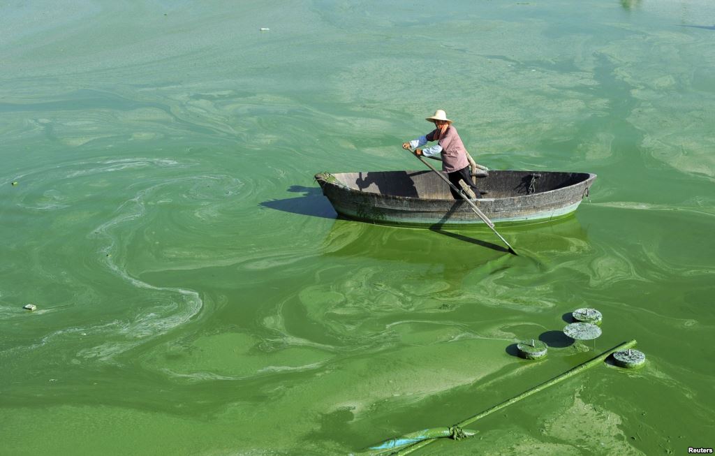 Le acque del lago di Chaohu a Hefei, nella provincia cinese di Anhui, sono inquinate a causa dei fertilizzanti utilizzati in agricoltura. L’acqua è diventata verde e i contadini sono costretti a remare con le loro barche, in questo mare di colore innaturale.
