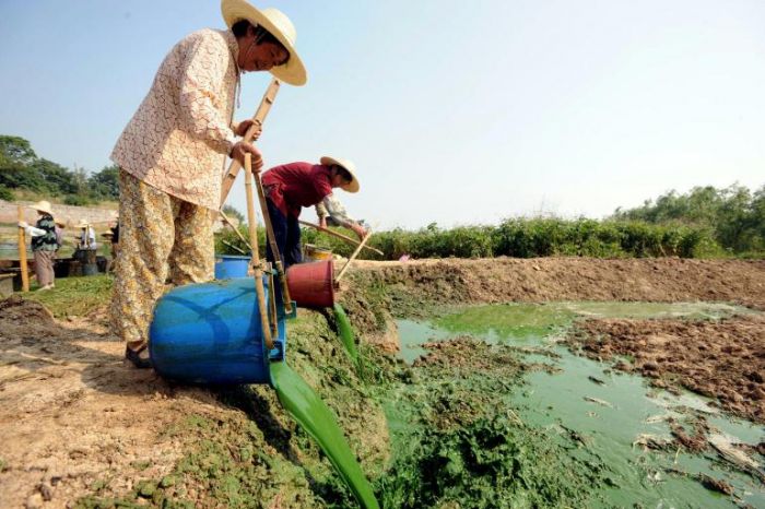 La colorazione è dovuta alle alghe che si sono sviluppate a causa dei fertilizzanti. I contadini del luogo hanno anche provato a ripulire il lago, creando una diga dove riversare l’alga colorata.