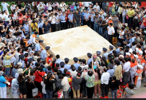 HUAINAN (CINA) – Prima hanno lavorato in 50 per sette ore per realizzarlo, poi dopo le foto di rito in migliaia se ne sono portati a casa un pezzettino. Si tratta di un enorme tocco di tofu, sorta di formaggio cinese che si ricava dal succo di soia. Centinaia di persone hanno scattato foto del gigantesco pezzo di tofu del peso di 8 tonnellate.