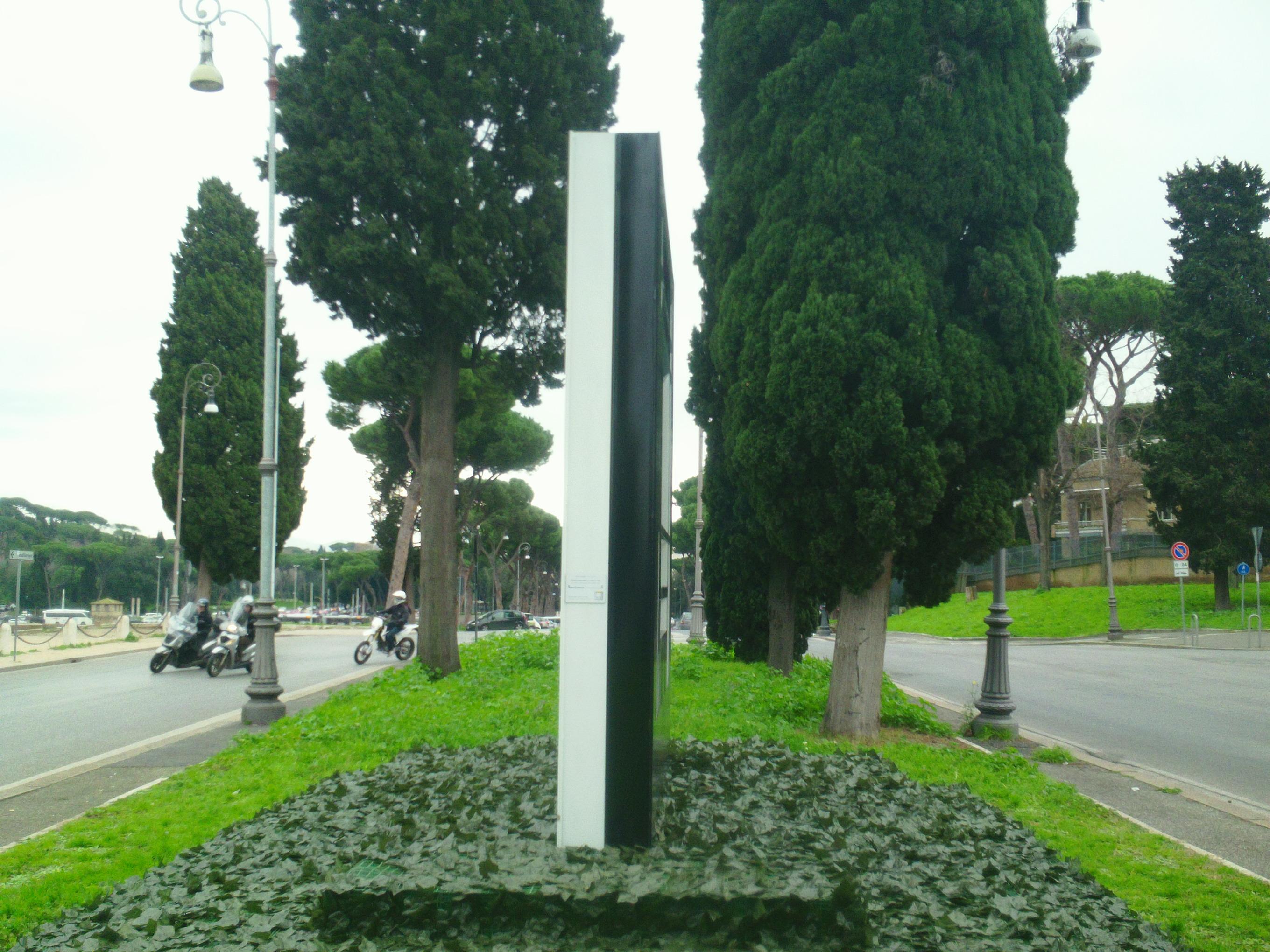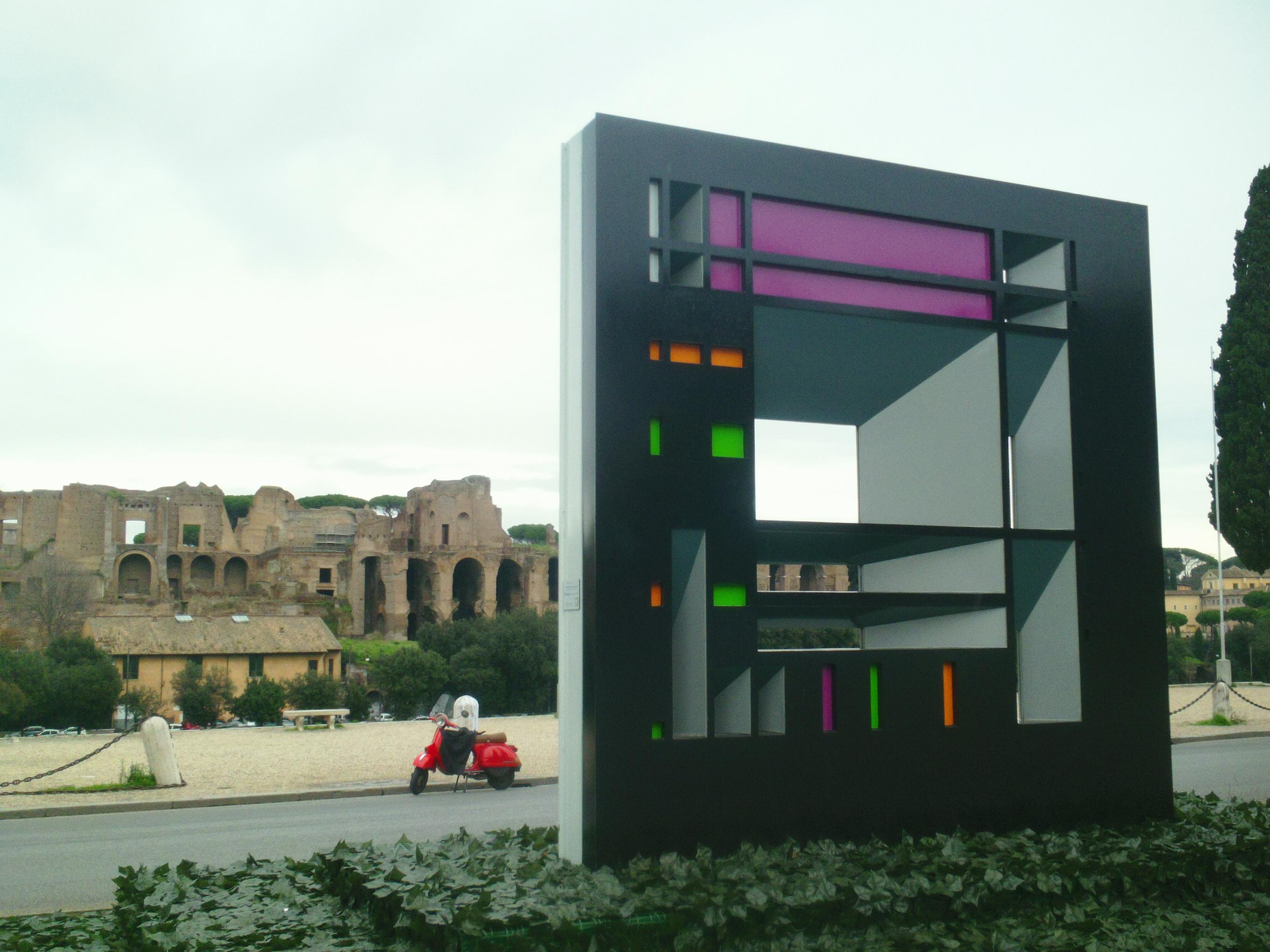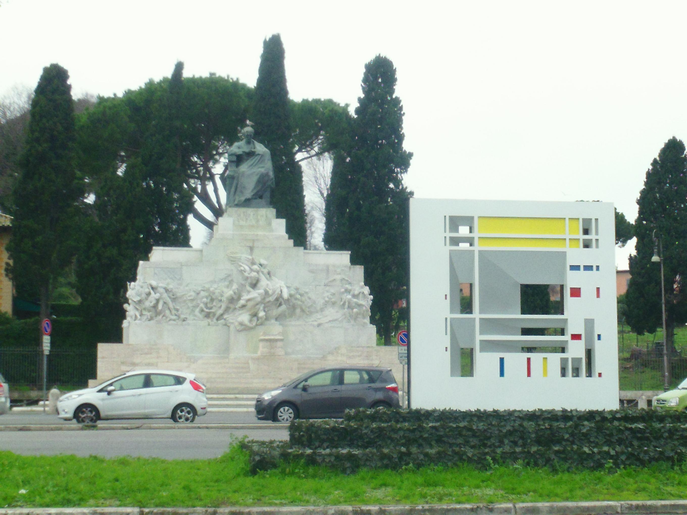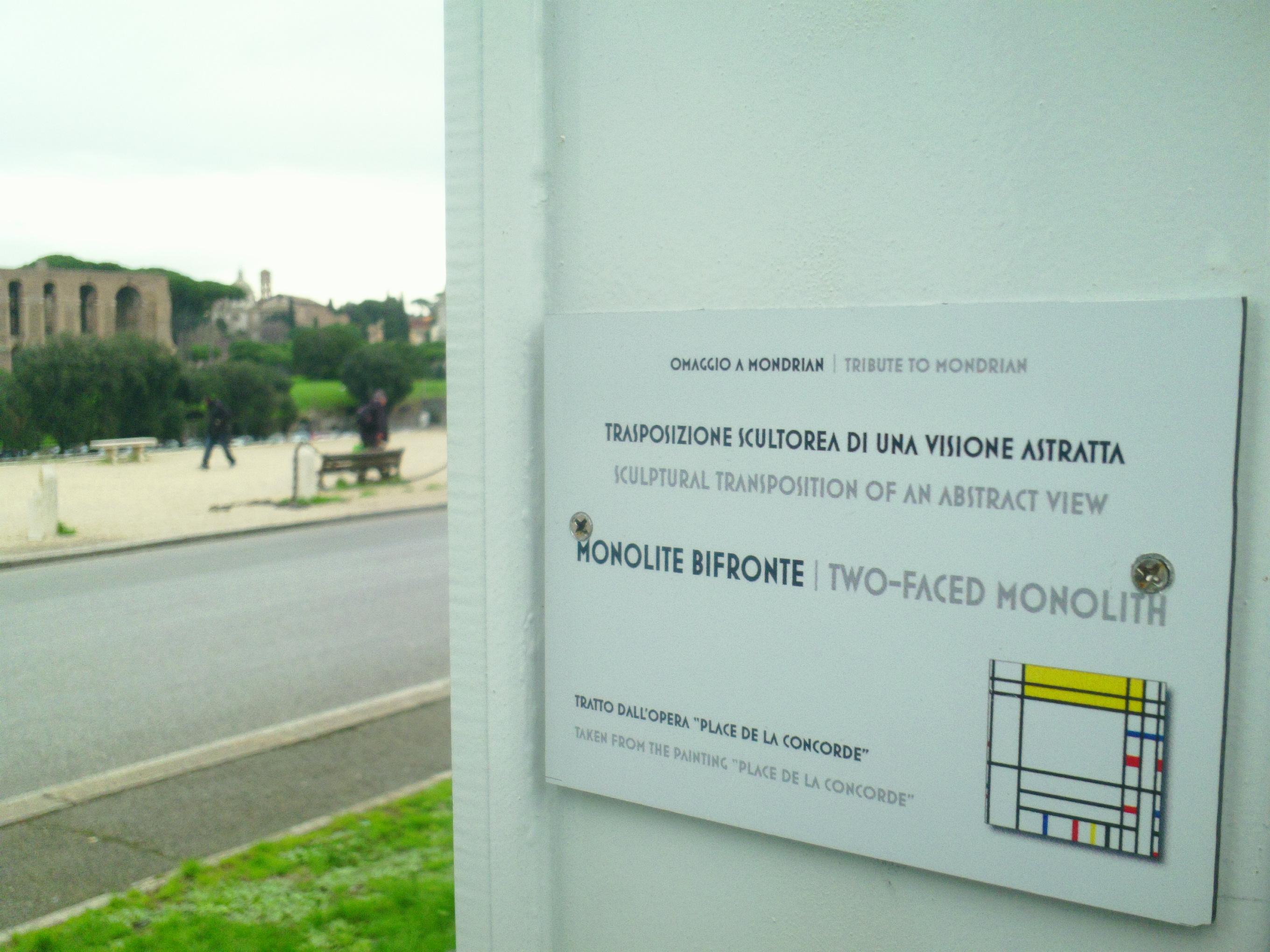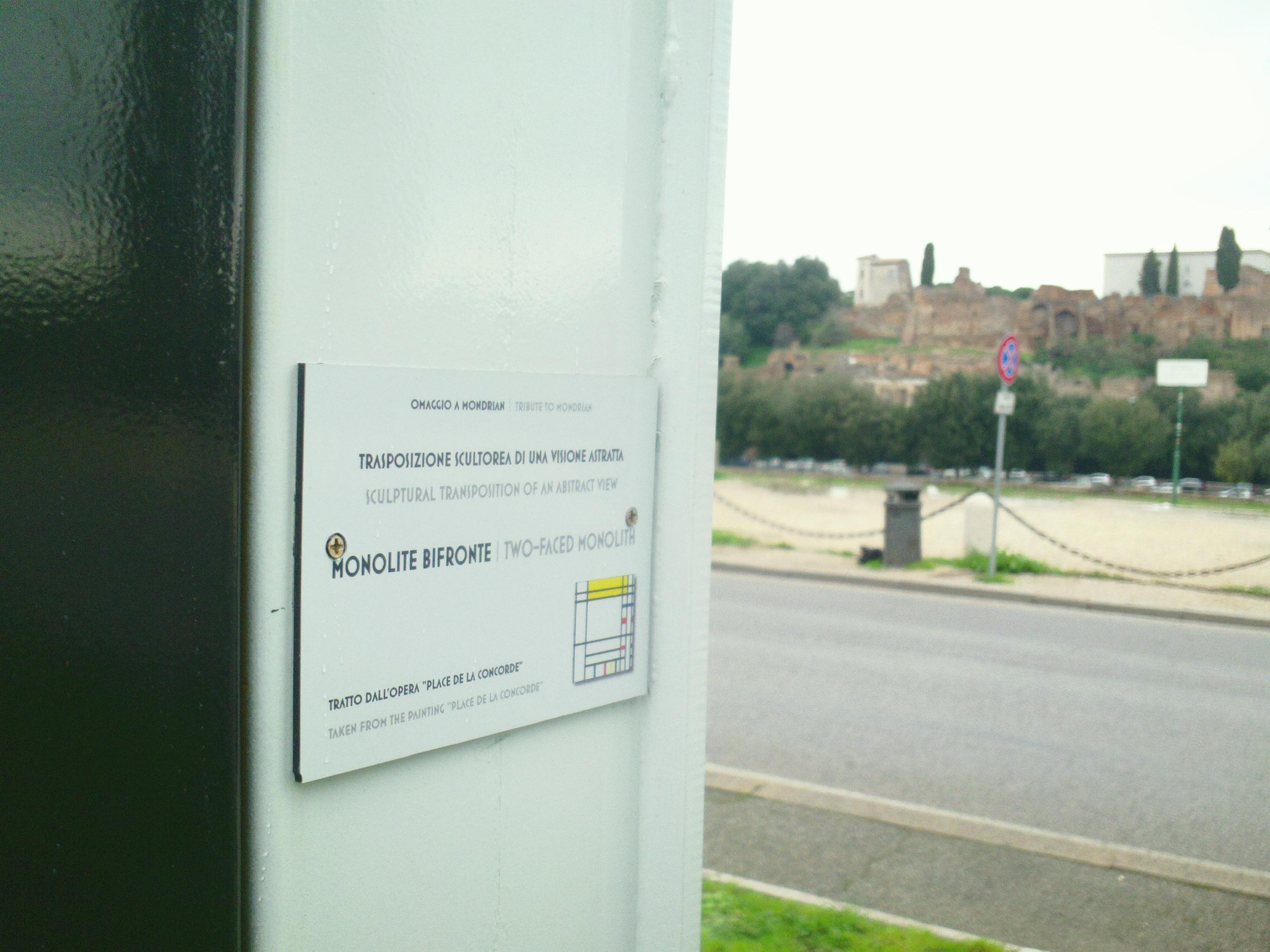 “Siamo nella notte tra il 24 e il 25 novembre 2013, ore 3. Dopo numerosi sopralluoghi (indisturbati anche quelli) l’artista romano Francesco Visalli arriva con un camion, devia il traffico con l’aiuto di collaboratori armati di segnaletica stradale e apposite luci, e pianta nell’aiuola di fronte al Circo Massimo il suo monolite «Place de la Concorde» che si colloca – dice l’autore – in un più vasto progetto «Inside Mondriaan». Il rinvio al grande artista olandese celebre nel mondo dell’arte e della pubblicità per il minimalismo geometrico dei suoi riquadri in cui il bianco si alterna al grigio e ai colori primari, è evidente. Racconta la curatrice dell’artista, Valeria Arnaldi: «Quella notte ridevamo tutti, sembrava una scena di “Amici miei” di Monicelli». Da quel giorno la scultura-installazione resta al suo posto. Nessuna ispezione. Nessun interrogativo”.