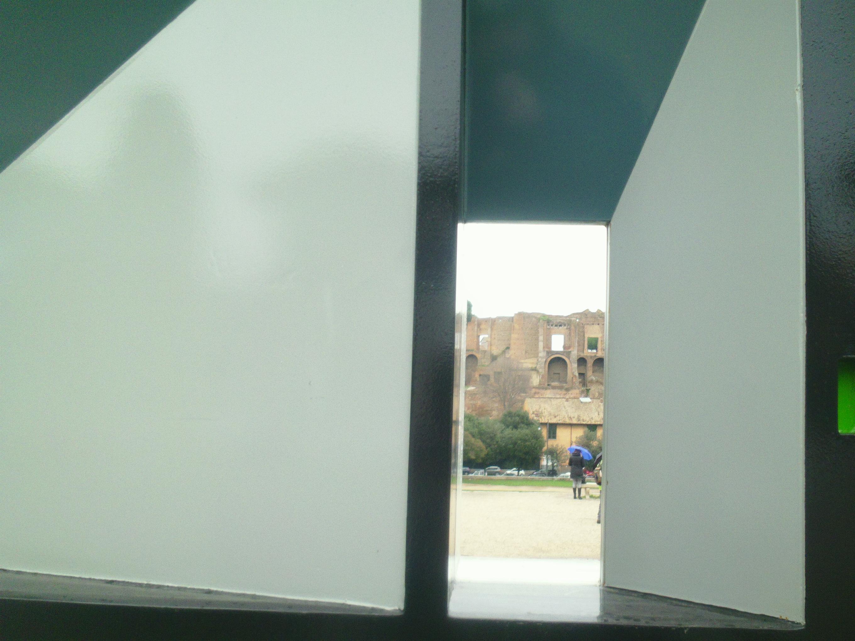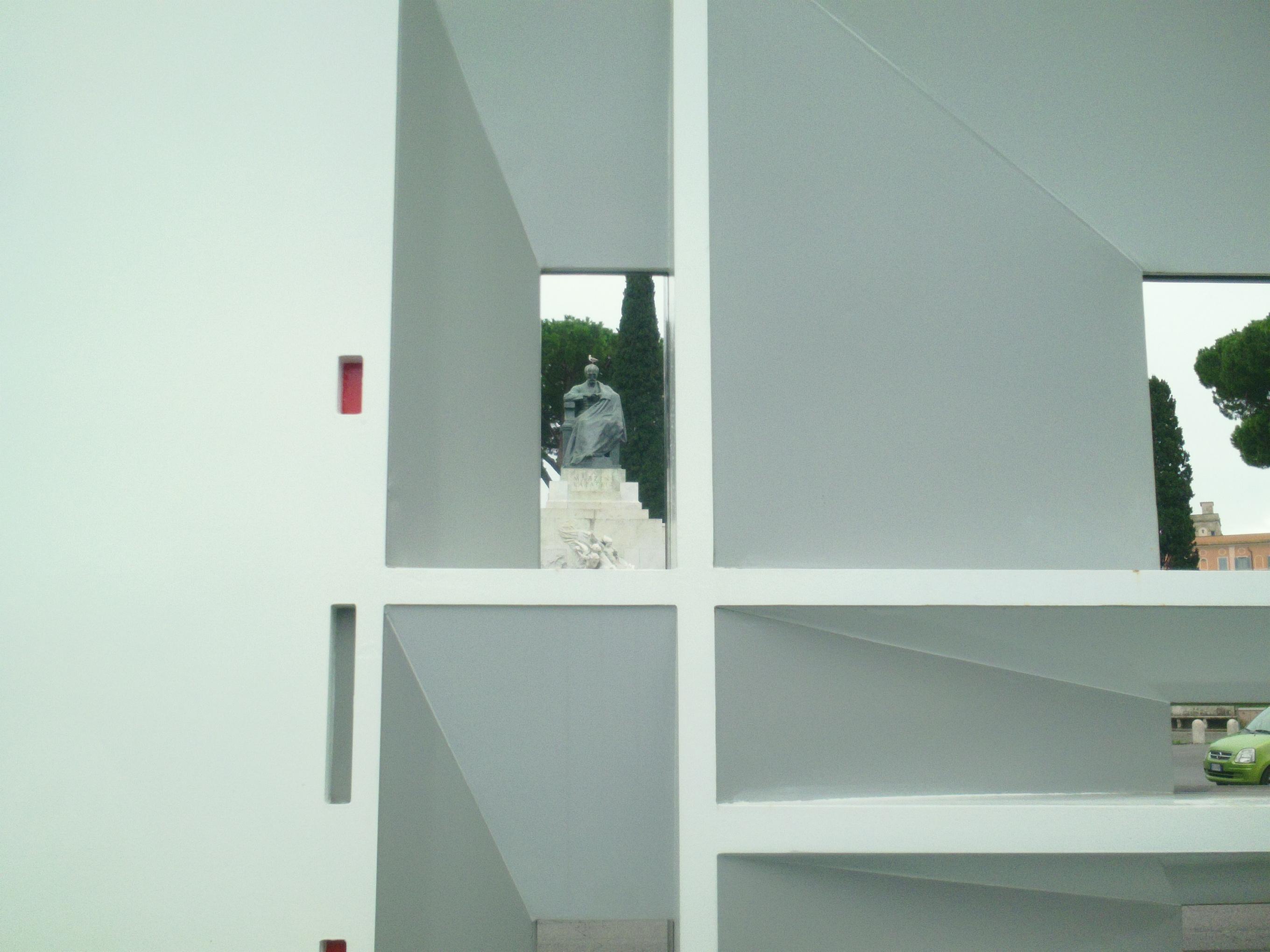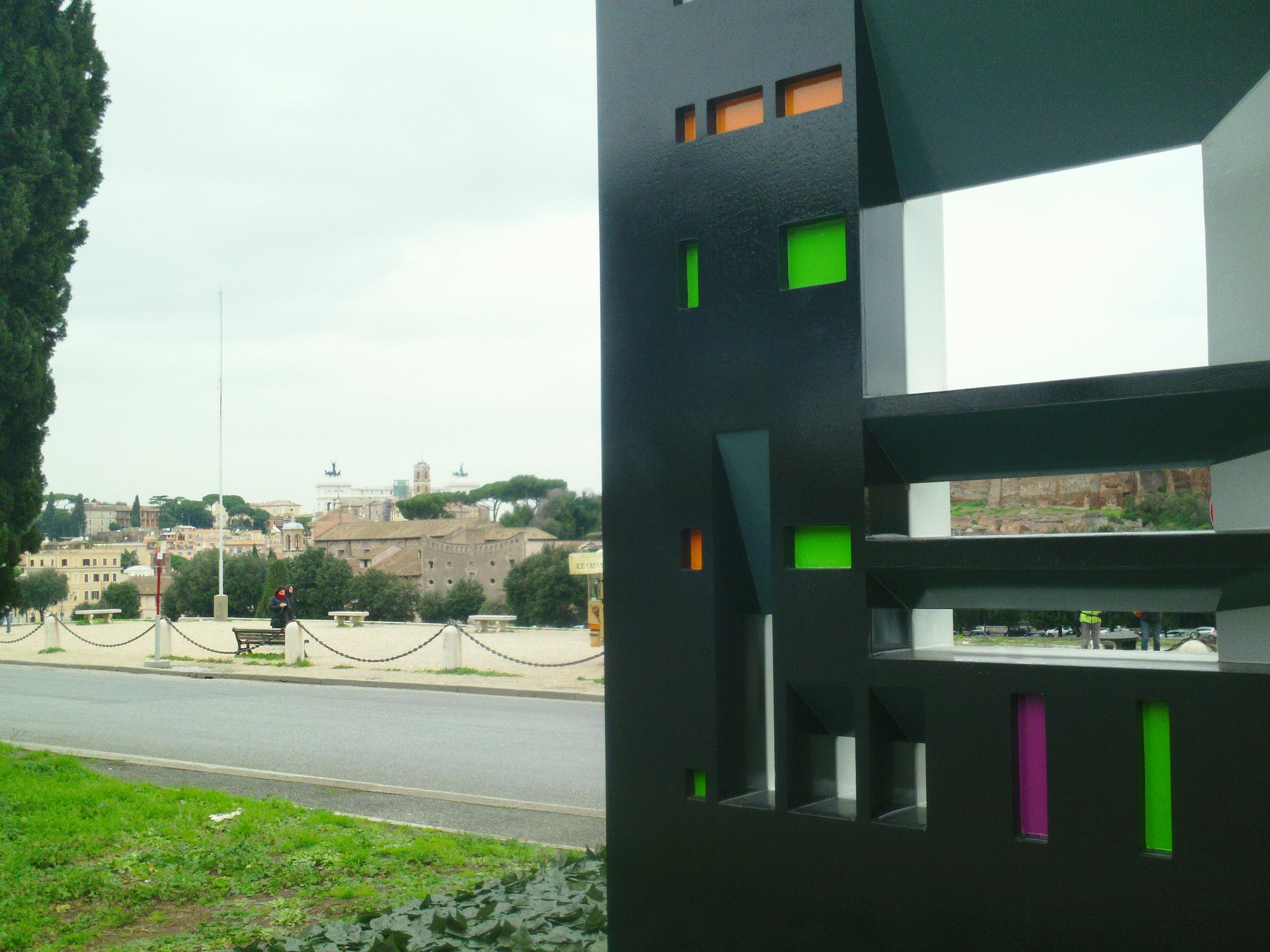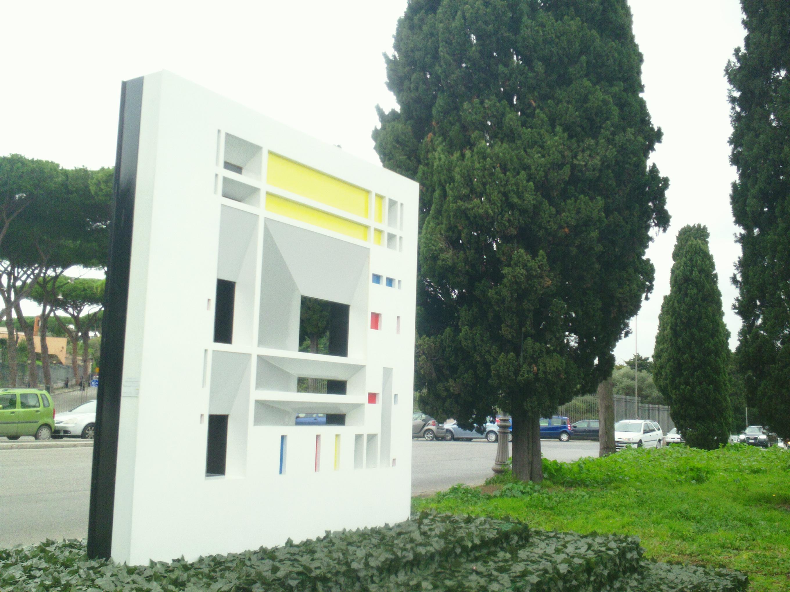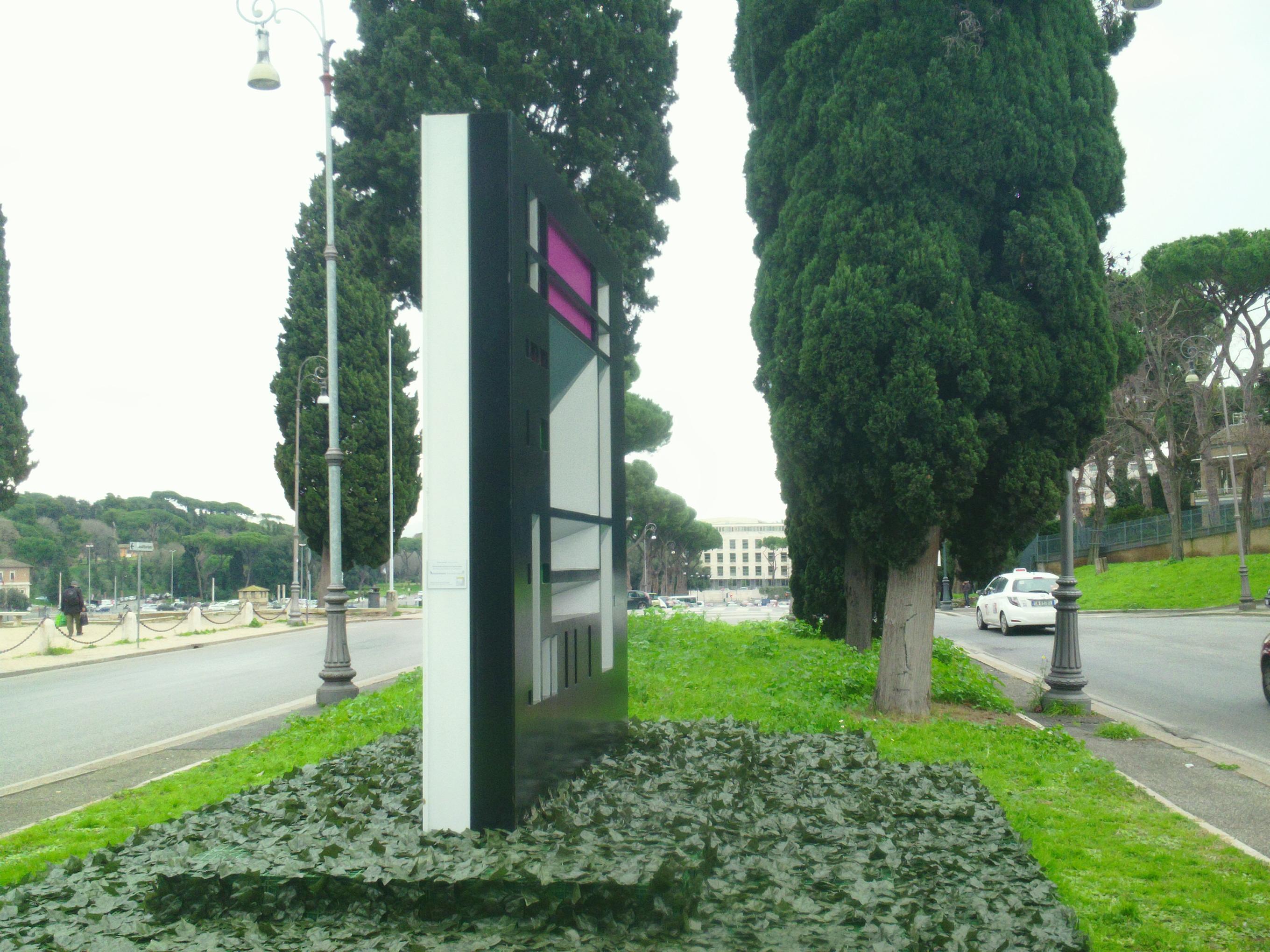 “Siamo nella notte tra il 24 e il 25 novembre 2013, ore 3. Dopo numerosi sopralluoghi (indisturbati anche quelli) l’artista romano Francesco Visalli arriva con un camion, devia il traffico con l’aiuto di collaboratori armati di segnaletica stradale e apposite luci, e pianta nell’aiuola di fronte al Circo Massimo il suo monolite «Place de la Concorde» che si colloca – dice l’autore – in un più vasto progetto «Inside Mondriaan». Il rinvio al grande artista olandese celebre nel mondo dell’arte e della pubblicità per il minimalismo geometrico dei suoi riquadri in cui il bianco si alterna al grigio e ai colori primari, è evidente. Racconta la curatrice dell’artista, Valeria Arnaldi: «Quella notte ridevamo tutti, sembrava una scena di “Amici miei” di Monicelli». Da quel giorno la scultura-installazione resta al suo posto. Nessuna ispezione. Nessun interrogativo”.