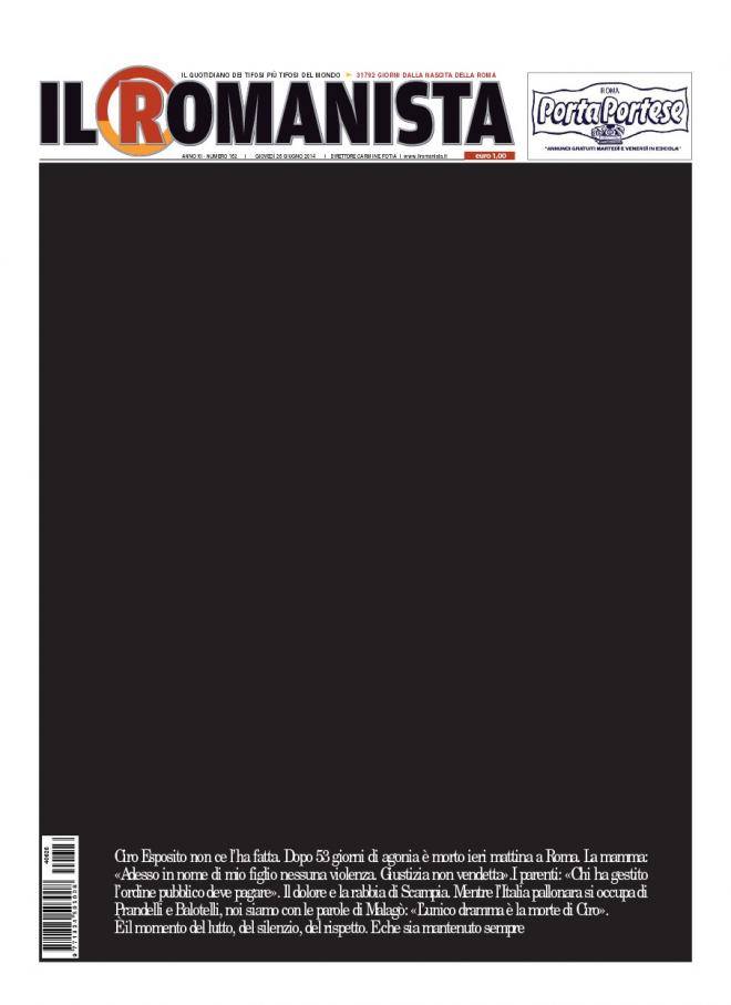 ROMA – Prima pagina totalmente nera per il quotidiano “Il Romanista” in segno di lutto per la morte di Ciro Esposito, il tifoso del Napoli ferito nel corso degli incidenti prima della finale di Coppa Italia tra il Napoli e la Fiorentina lo scorso 3 maggio e morto ieri mattina al Gemelli dopo 50 giorni di agonia.