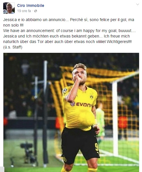 DORTMUND, GERMANIA – “Jessica e io abbiamo un annuncio… Perché sì sono felice per il gol, ma non solo!!!“. Ciro Immobile ieri sera sulla sua pagina Facebook, in tre lingue, italiano, inglese e tedesco. Ma in realtà bastano i gesti per capire.