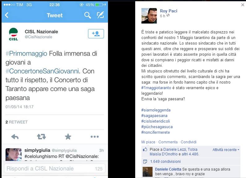 ROMA – La festa del Primo maggio come una gara a chi ce l’ha più grosso, il concerto. La Cisl, uno dei tre sindacati che hanno organizzato il tradizionale concertone in piazza San Giovanni a Roma, ha definito in un tweet il concerto di Taranto una “saga paesana”, scatenando reazioni polemiche. (Chi gestisce il profilo intendeva proprio scrivere “saga” e non “sagra”, come precisato in successivi tweet)
