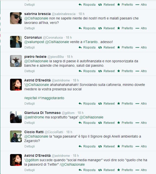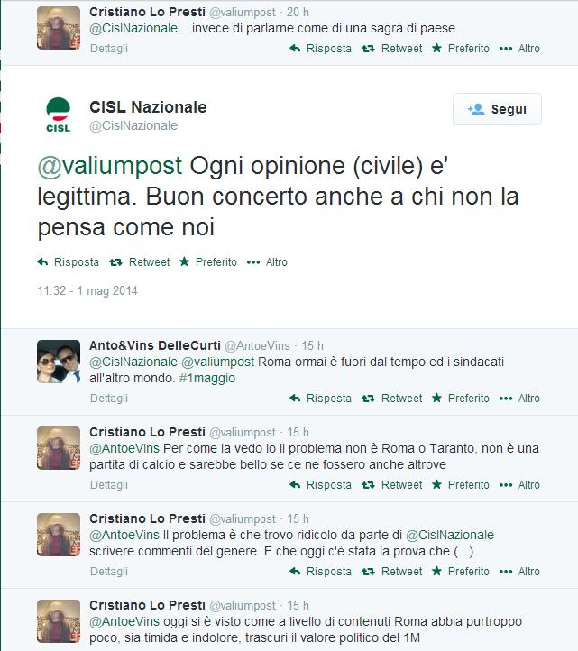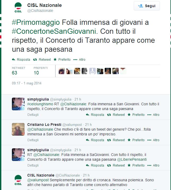 ROMA – La festa del Primo maggio come una gara a chi ce l’ha più grosso, il concerto. La Cisl, uno dei tre sindacati che hanno organizzato il tradizionale concertone in piazza San Giovanni a Roma, ha definito in un tweet il concerto di Taranto una “saga paesana”, scatenando reazioni polemiche. (Chi gestisce il profilo intendeva proprio scrivere “saga” e non “sagra”, come precisato in successivi tweet)