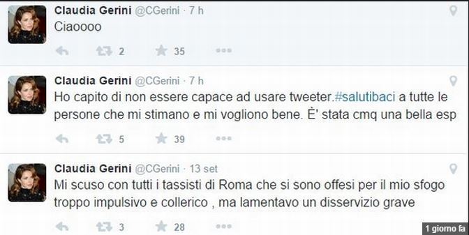 Il Messaggero scrive che la Gerini sabato ha affidato a Twitter la sua lamentela per il taxi introvabile in stazione: