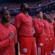 I ragazzi di coach Doc Rivers nel riscaldamento hanno lasciato le giacche della tuta a metà campo ed effettuato il riscaldamento con le t-shirt al contrario per non mostrare al pubblico dell’Oracle Arena la scritta Clippers, inoltre indossavano fasce nere sui polsi e sulle braccia e calze nere sempre in segno di dissenso contro il razzismo. La partita è stata vinta da Golden State per 118-97 trascinata da un super Stephen Curry autore di 33 punti con il carrer high nei playoff di 7 canestri da tre punti realizzati. Andre Iguodala ne ha aggiunti 22 con 9 assist, mentre non sono bastati ai Clippers i 26 punti di Jamal Crawford e i 21 con 6 rimbalzi di Blake Griffin. La serie è ora sul 2-2 e si sposta di nuovo a Los Angeles per gara 5 in programma martedì notte.